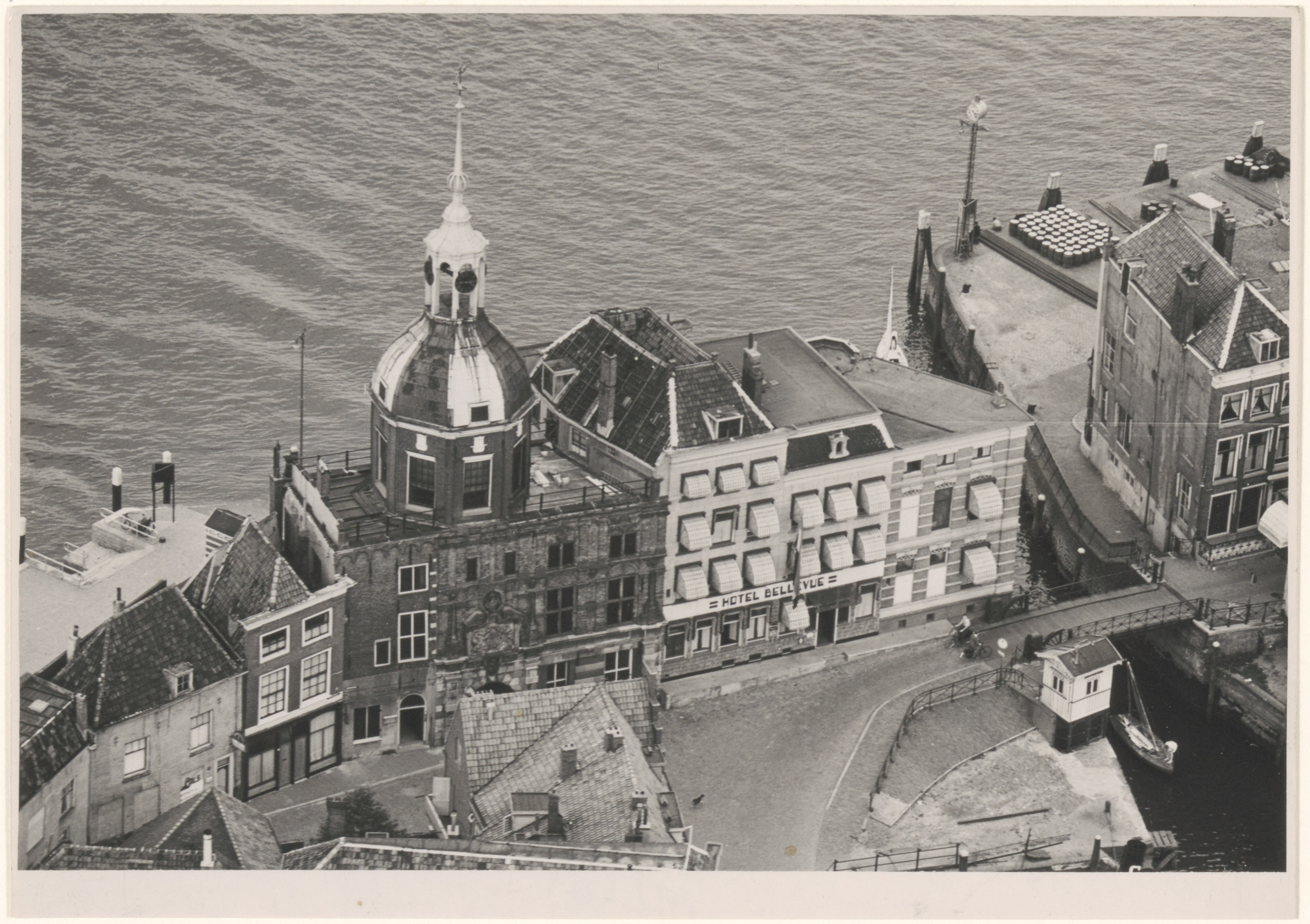 - Luchtfoto van de hoek Wijnstraat / Boomstraat met de Groothoofdspoort en hotel Bellevue. Rechts de Boombrug en de Merwekade.