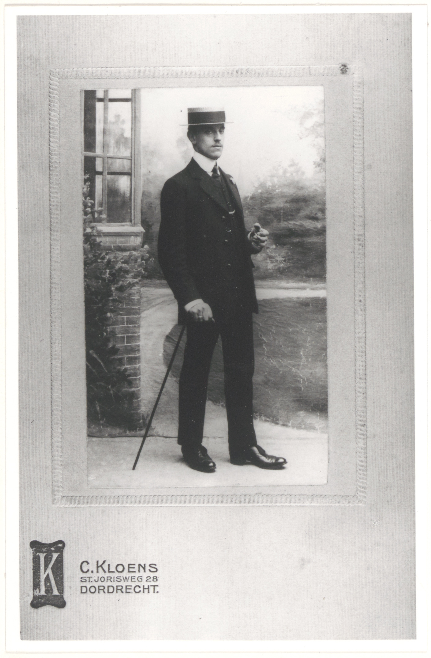 Antonius Leonardus Theodorus Hurkmans, in een studiodecor, met strohoed en wandelstok, op 18-jarige leeftijd, geboren te Dordrecht op 30 augustus 1893, overleden in 1970, meubelmaker; huwde op 28 januari 1915 Martina Francisca Valk.