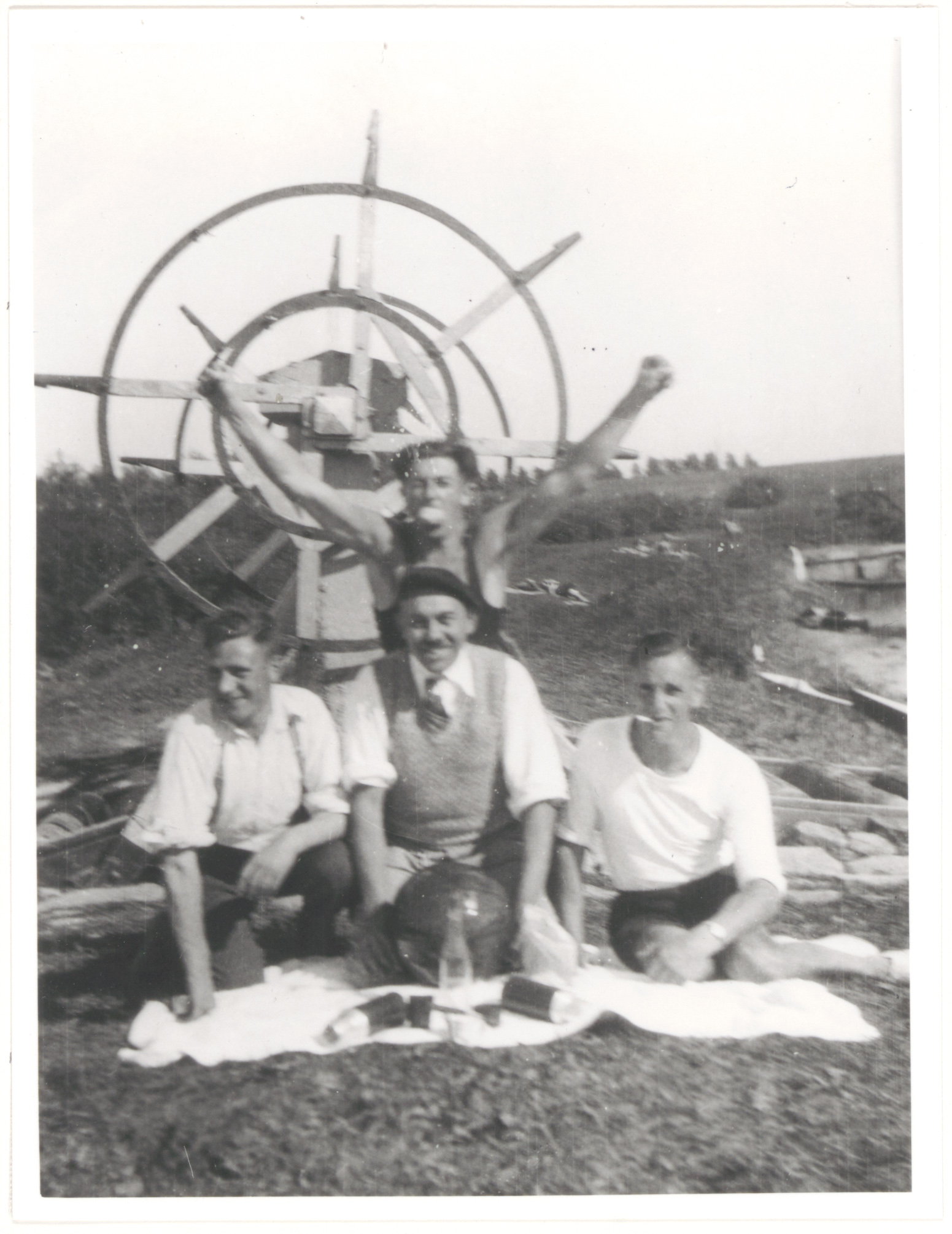 Zgn. rol of overtoom aan het noordelijke eind van de niet meer bestaande kreek Vogelaar die ten westen van en ongeveer parallel aan de Baanhoekspoorweg liep, op het dijkje tussen die kreek en de Boven Merwede, ten noorden van de huidige Gevudo; met de rol werden de bootjes van Sliedrechtse melkboeren over het dijkje getakeld (op rollen) om de omweg over het Wantij te besparen; het gezelschap voor de rol: A.L.Th. Hurkmans (meubelmaker Sluisweg), links Henk B. Spaaij (rijwielhersteller Sluisweg) en staand met geheven armen Ernst H. Willems (koopman Pelserbrug); de vierde man is onbekend.