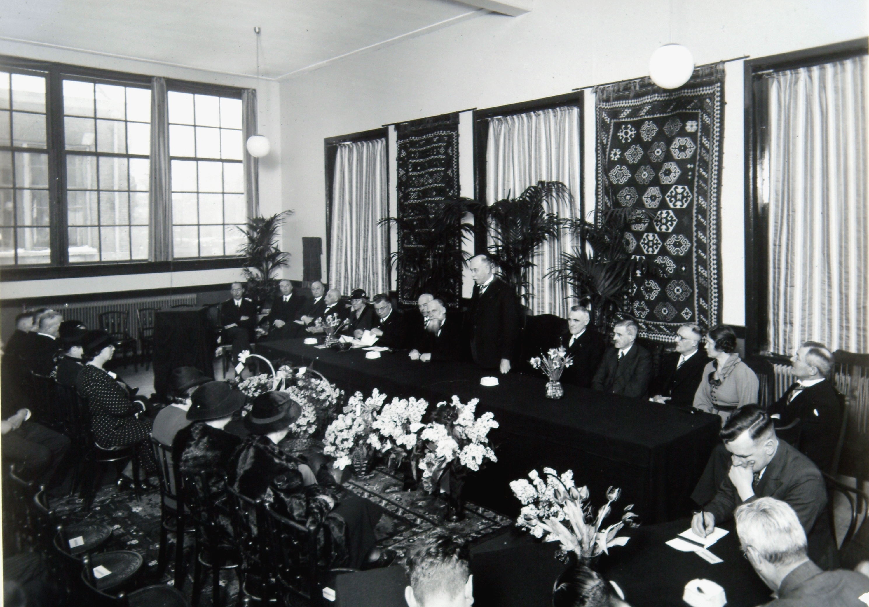 - Burgemeester de Gaay Fortman aan het woord tijdens de opening van de Dr. Van Voorthuyzenstichting aan de Cornelis de Wittstraat. De stichting was een soort voorloper van de sociale werkplaats voor gehandicapten en minder begaafden.