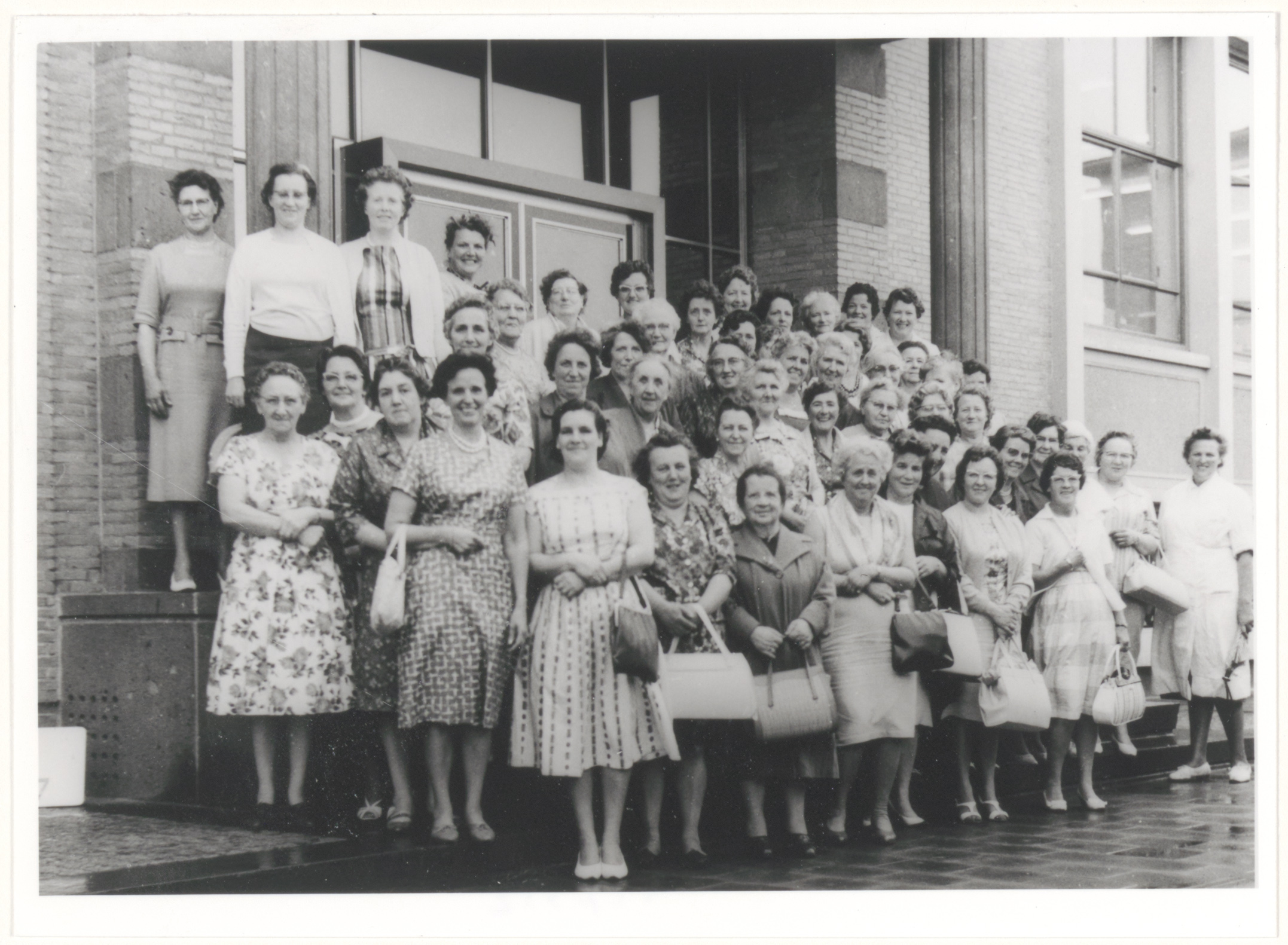 - Een groep onbekende dames met handtassen op de stoep van het kantoor van supermarkt De Gruyter aan de Veemarktkade in Den Bosch.