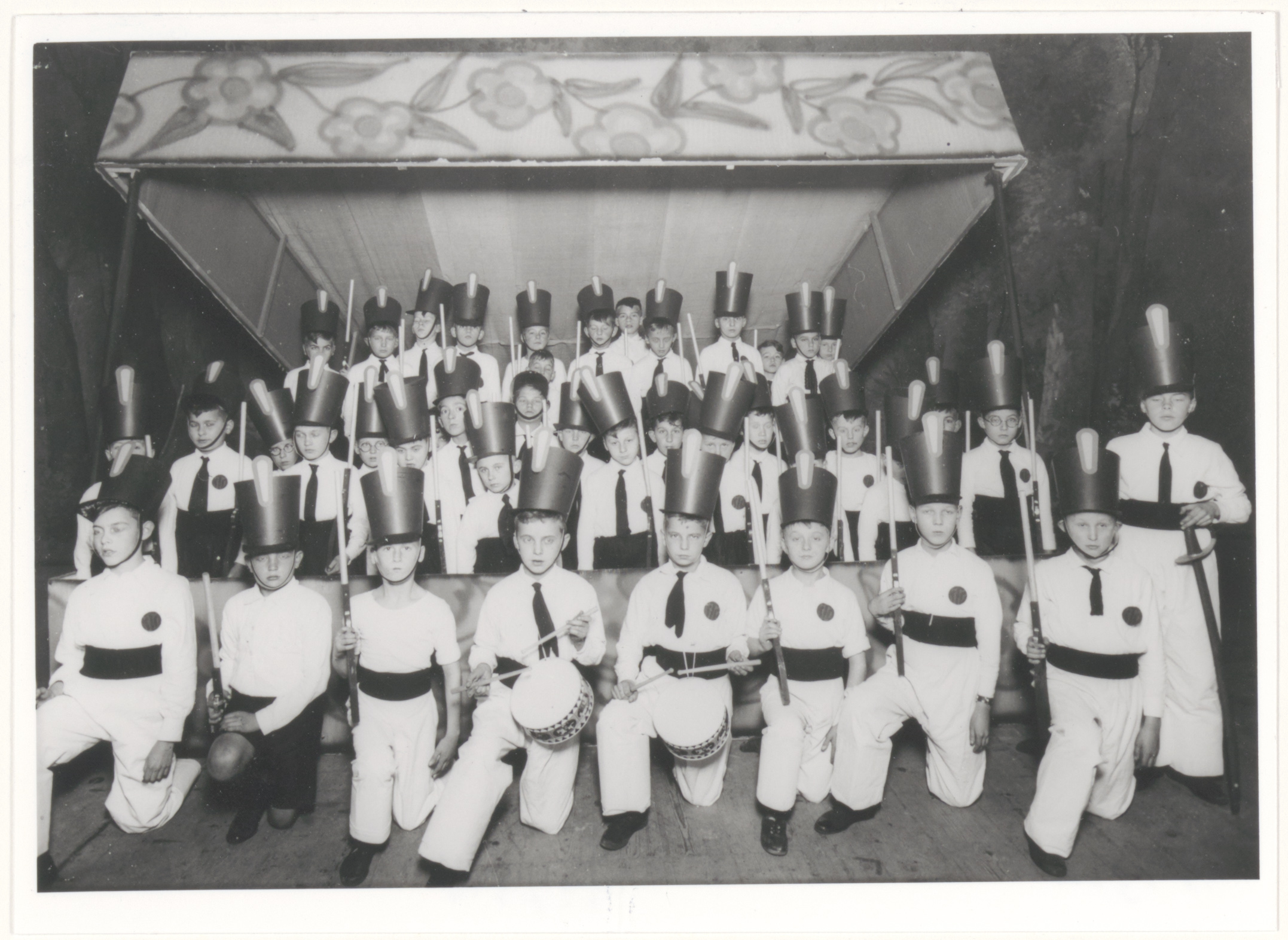 Junioren van de Katholieke Turnclub Dordrecht op het toneel van Kunstmin in een revue ter gelegenheid van het eerste lustrum van de Katholieke Sportbond Dordrecht in 1935; met papieren hoeden en geweren marcheerden zij op de muziek van de Parade der Tinnen Soldaatjes (Heizelmännchen).