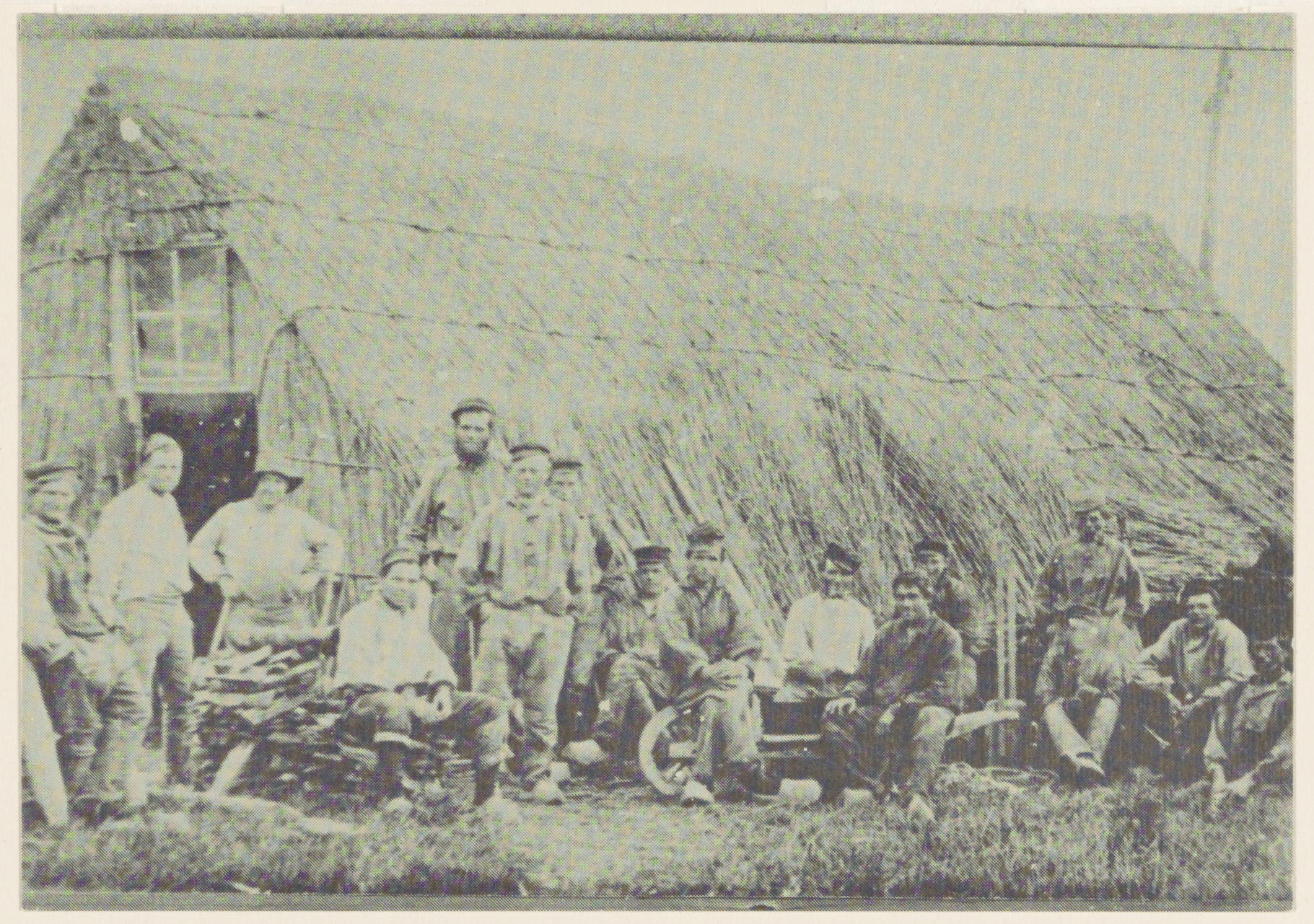 Een groep rustende griendwerkers voor een rieten schuur ergens in de Biesbosch; …