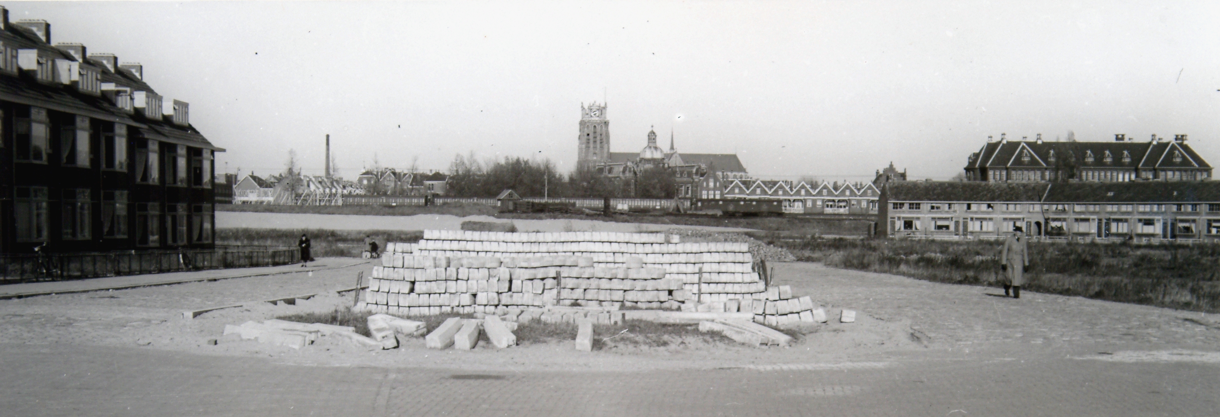 Van het Hugo de Grootplein via de aan te leggen Erasmuslaan naar het noorden. De huizenrij rechts is de Van Manderstraat, het gebouw erachter is verzekeringsmaatschappij Eerste Nederlandsche. Links daarvan huizen in de Havenstraat. In het midden villa Rozenhof en daarachter de Grote Kerk.