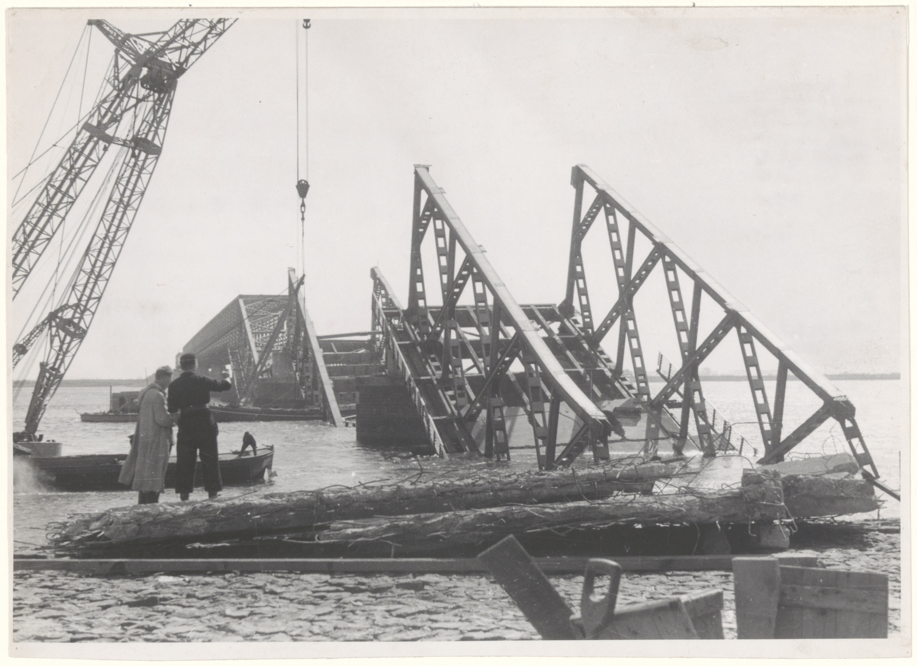 - Het lichten van een in 1944 vernield brugdeel van de Moerdijk verkeersbrug.
