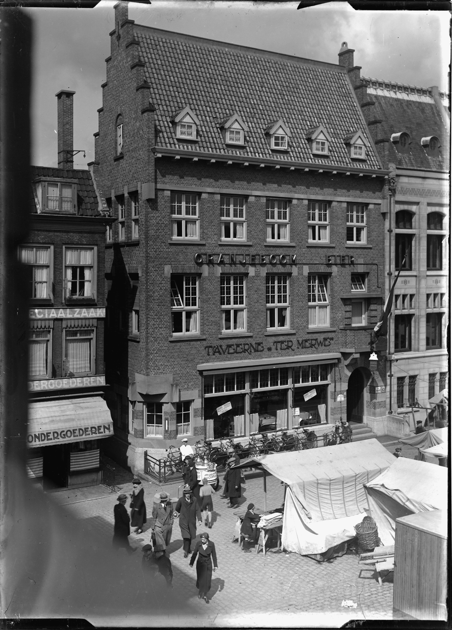 Marktkramen op de noordwest hoek van het Scheffersplein. Rechts naast restaurant Ter …