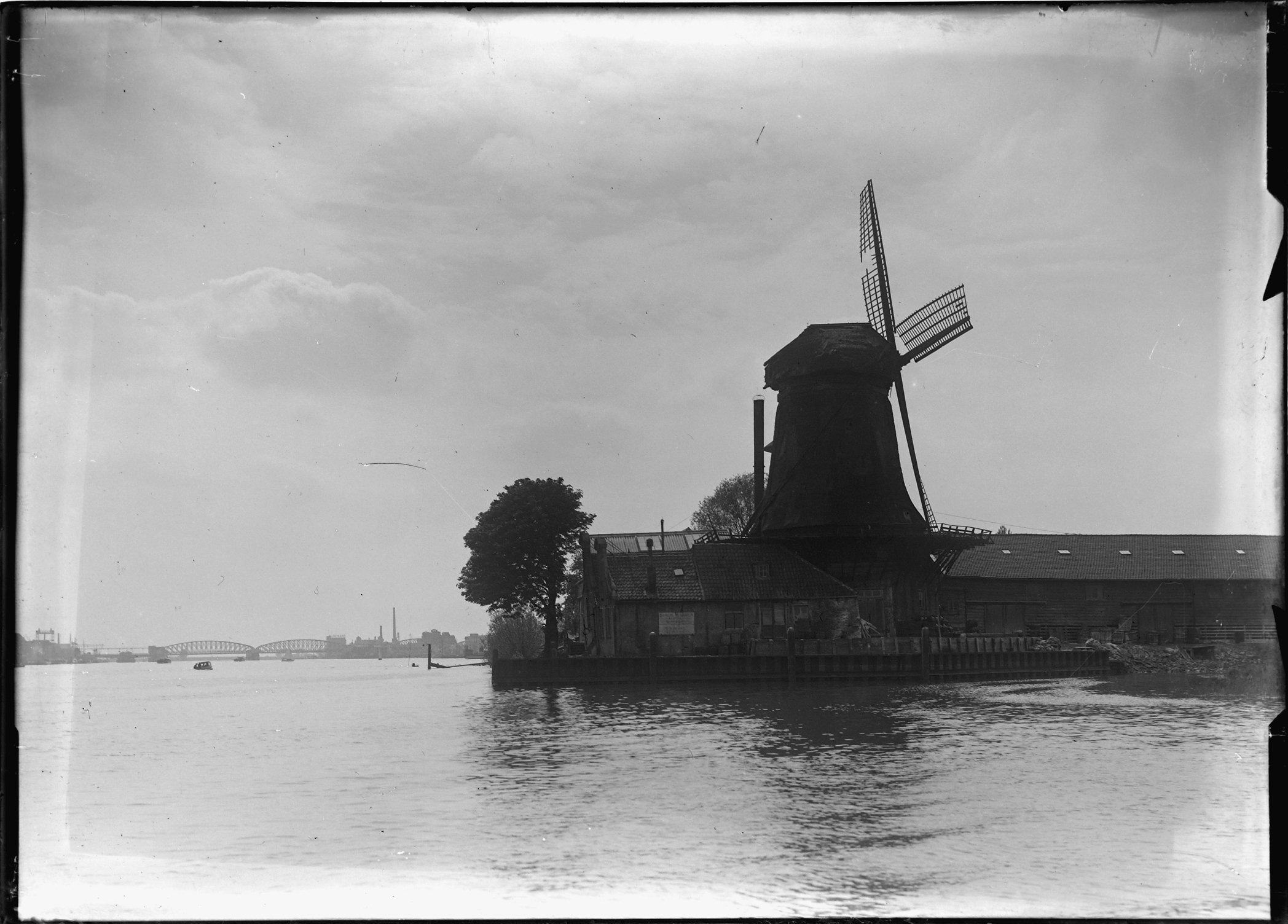 De Oude Maas en molen Welgelegen in Zwijndrecht. Op de achtergrond de bogen van de spoorbrug, geheel links de heftoren van de Dokbrug.