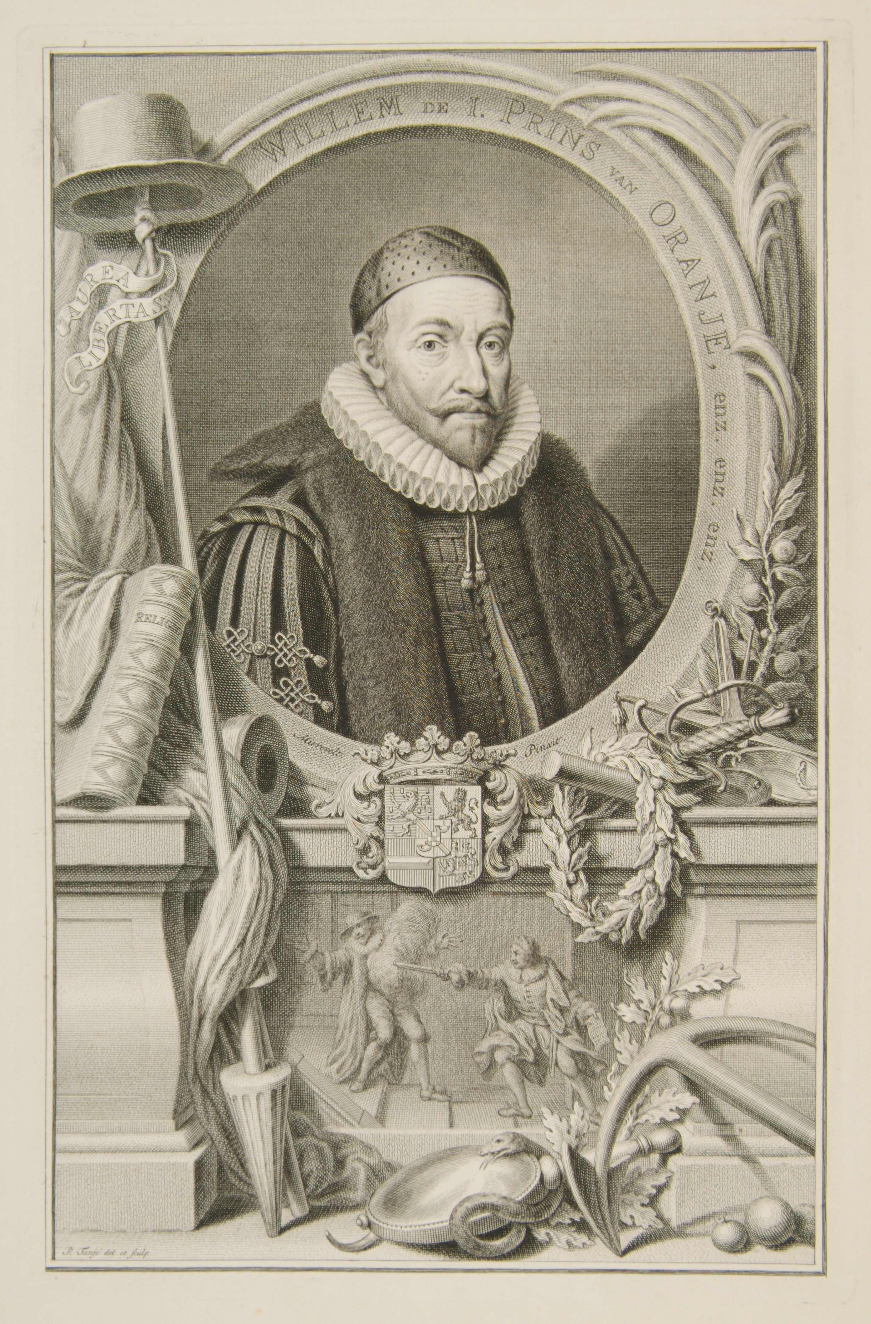- Portret van Willem I, Prins van Oranje Onder het randwerk een voorstelling van de aanslag te Delft