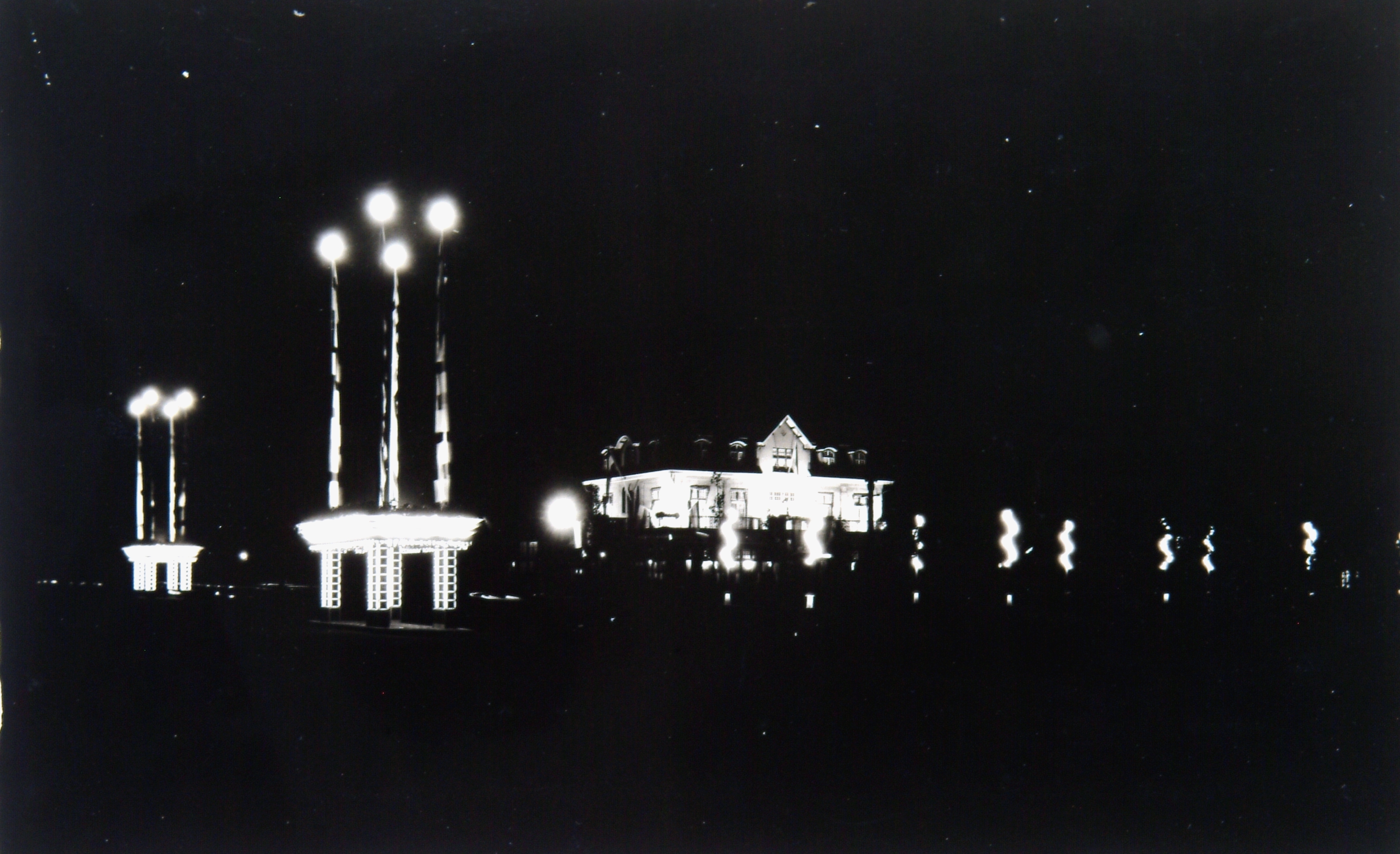 - Bij feestelijkheden voor de opening van de zeehaven stonden "lichteilanden"op het Stationsplein en kurkentrekkerachtige verlichting op de Stationsweg. Het verlichte gebouw is Hotel Ponsen.