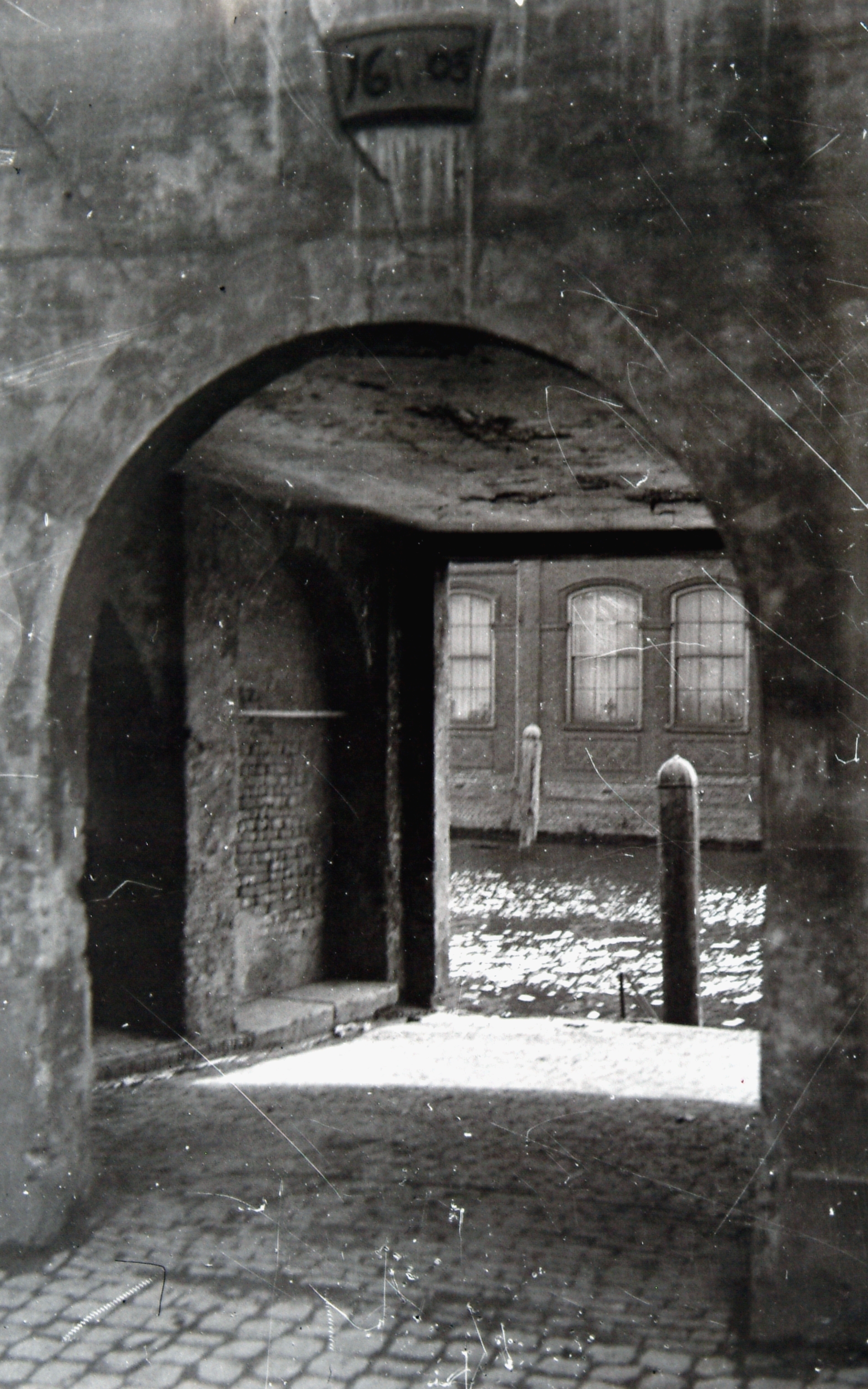 - Een kijkje door de Botgenspoort naar de Spuihaven. Aan de overkant is een deel van de gevel van de B.L.O.school te zien.