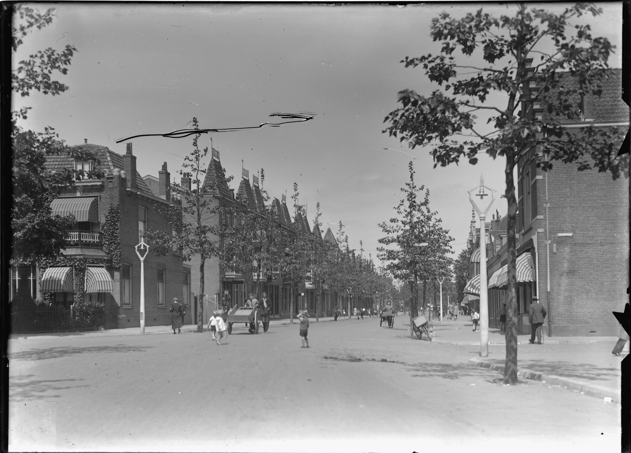 - De Dubbeldamseweg vanaf kruising Emmastraat/Rozenstraat (rechts) in de richting van de Mauritsweg gezien.