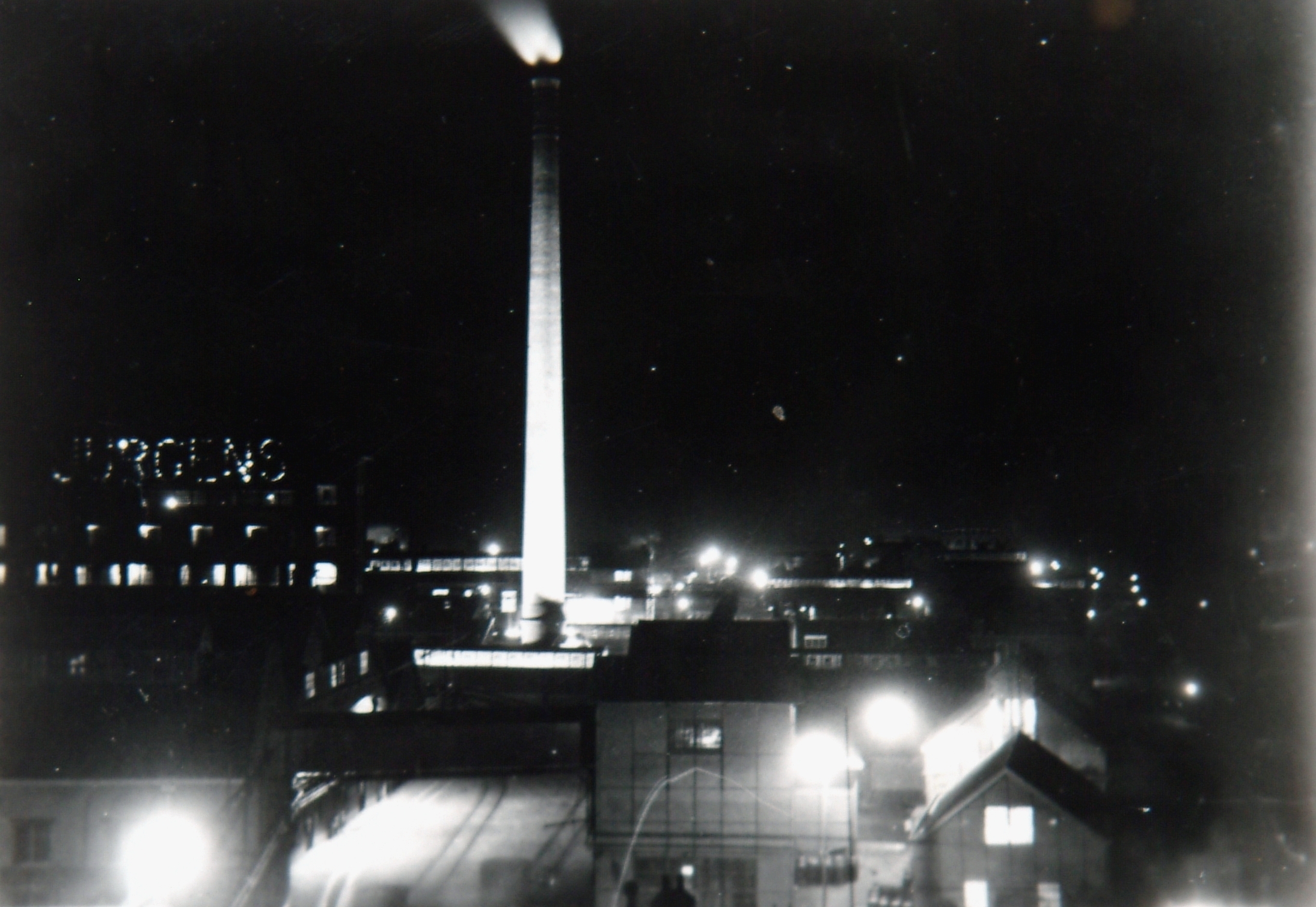 - De verlichte schoorsteen van de Jurgens-fabriek in Zwijndrecht t.g.v. de opening van de zeehaven.