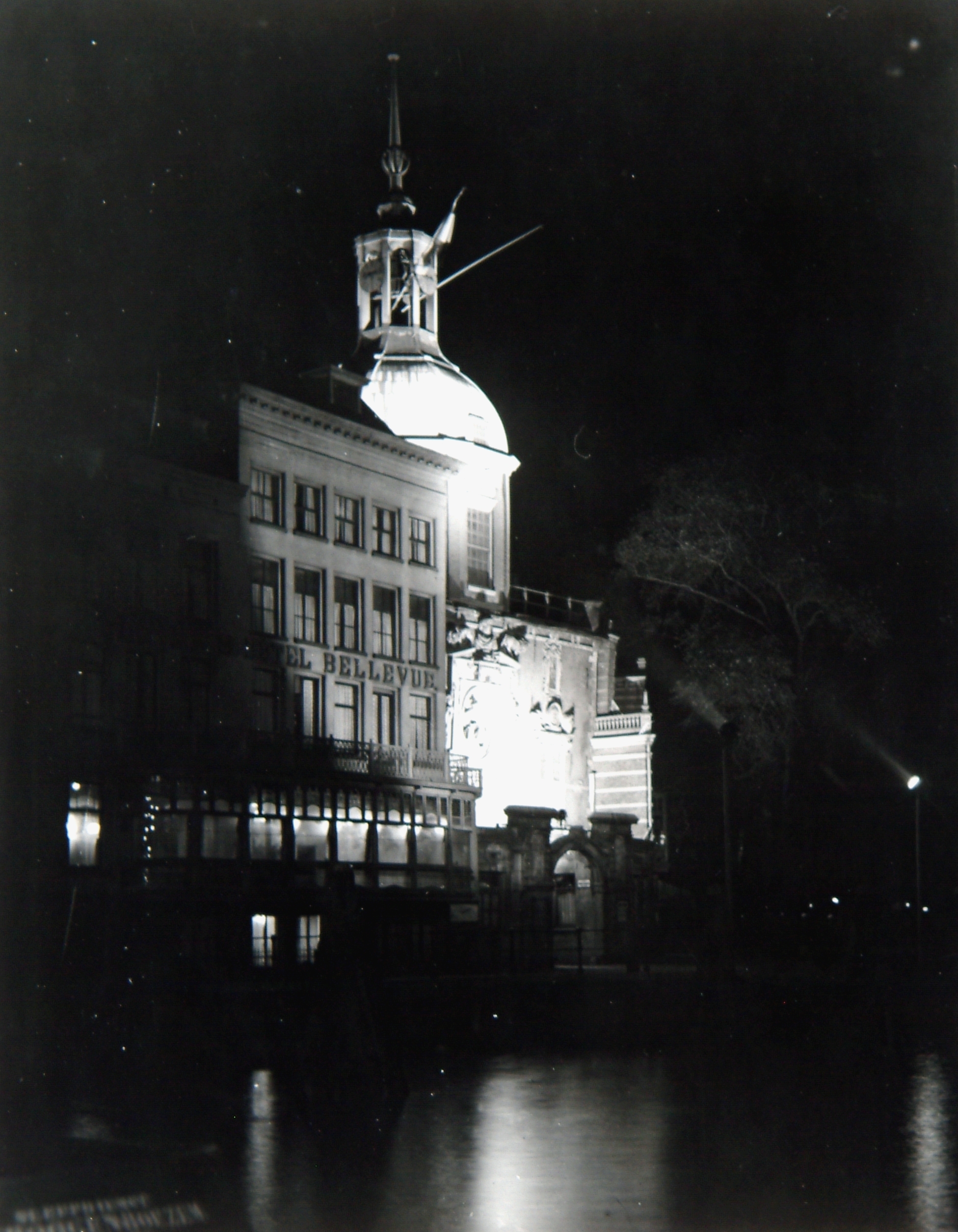 - De verlichte Groothoofdspoort en Hotel Bellevue in de Boomstraat, vanaf de rivier gezien. De verlichting was aangebracht t.g.v. de Septemberfeesten bij de opening van de zeehaven.