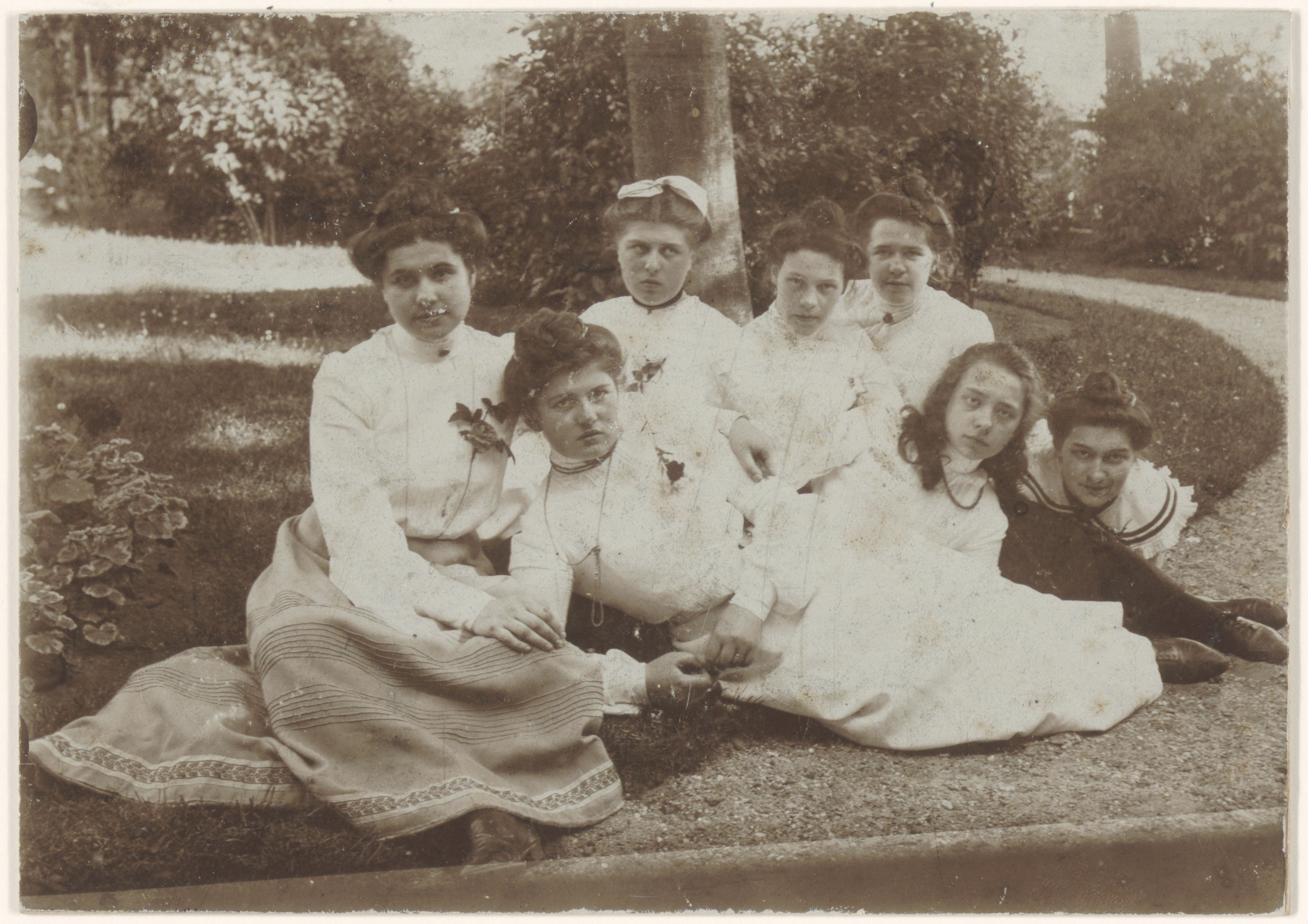Groepsportret van 7 jonge vrouwen in een tuin of park; op de achterzijde zijn de …