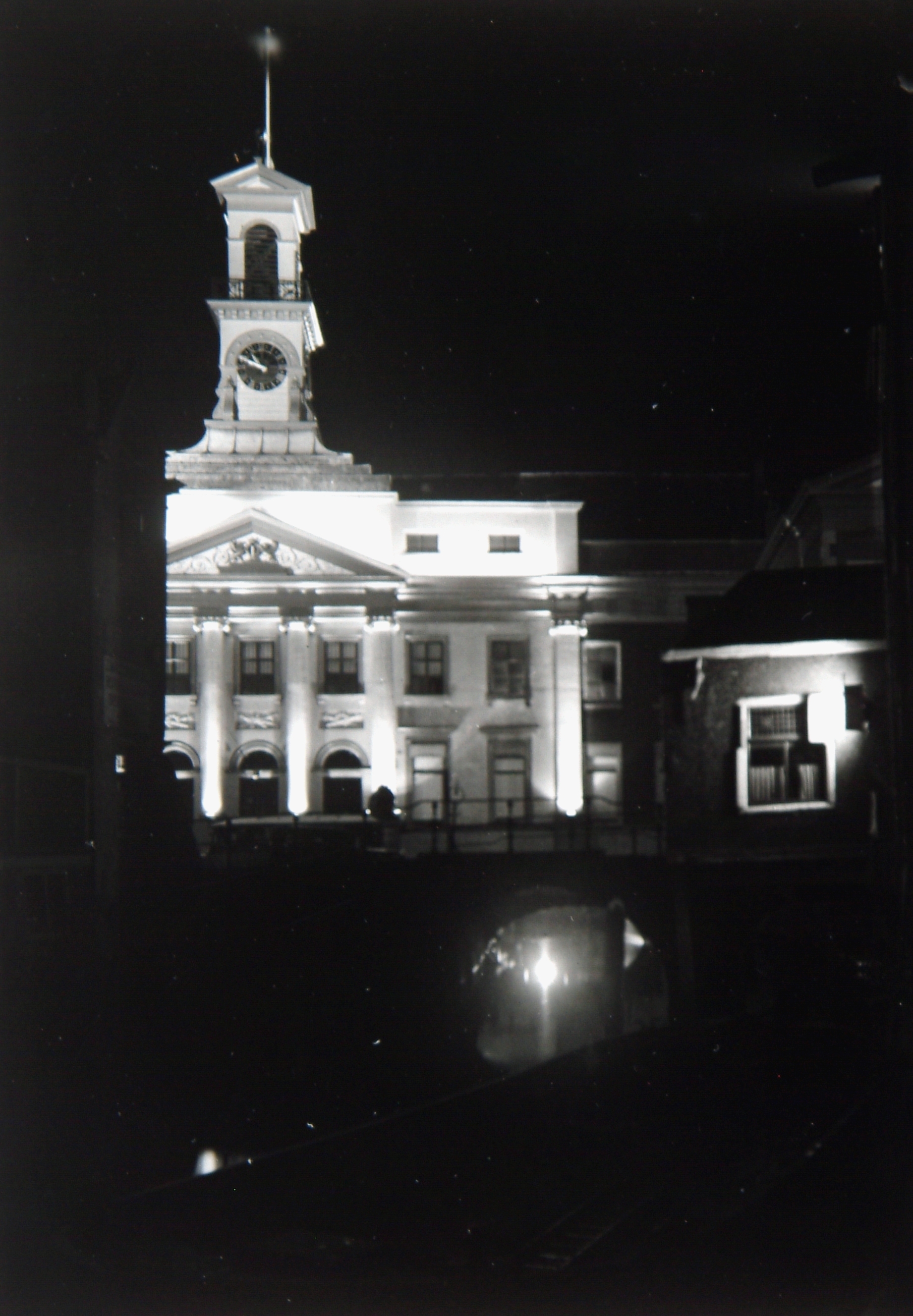 Verlichte voorgevel van het stadhuis gezien vanaf de Spuisteiger. De boog in het midden …