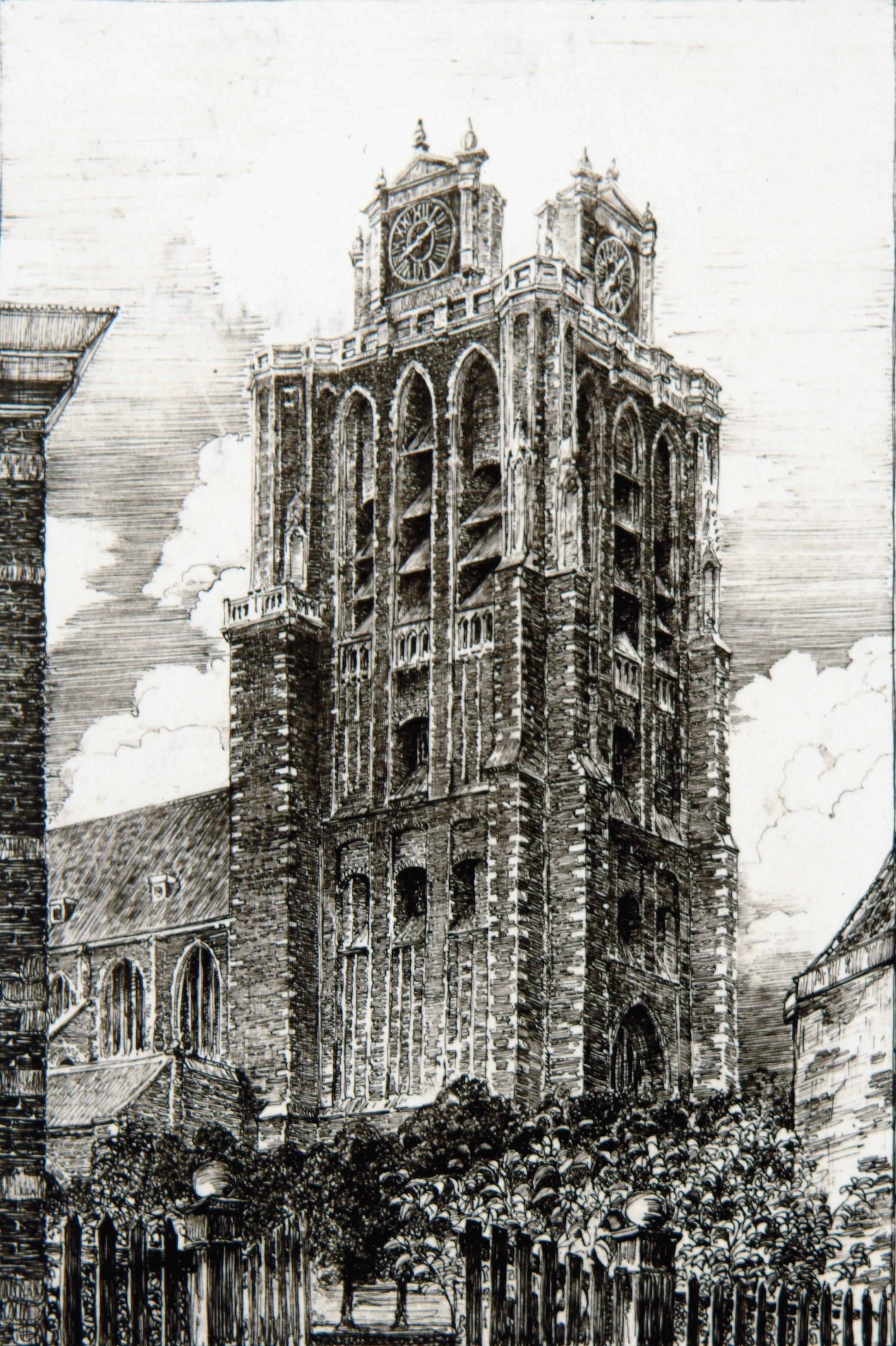 Tekening van de Grote Kerk gezien vanaf het Maartensgat