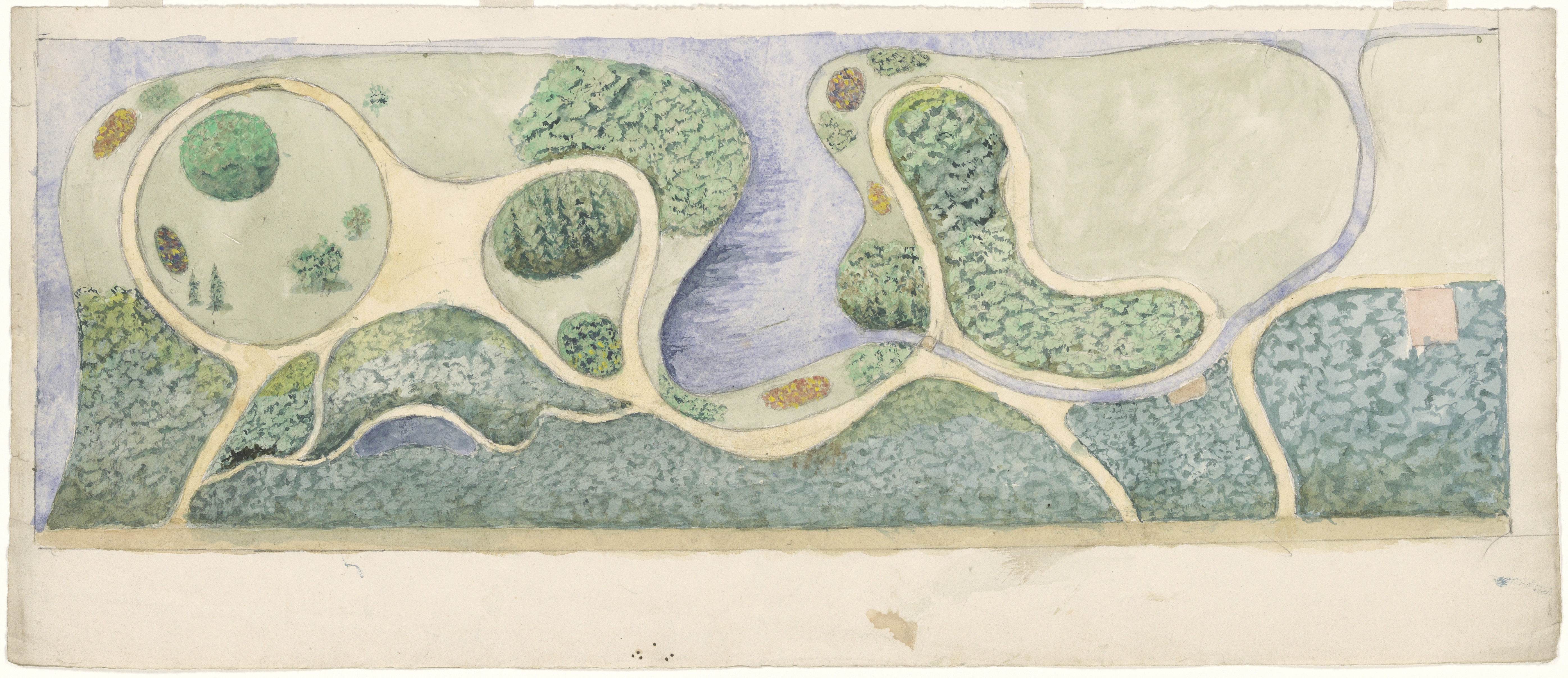 Plattegrond voor de inrichting van het park op het landgoed Louterbloemen bij de Mijlweg.
