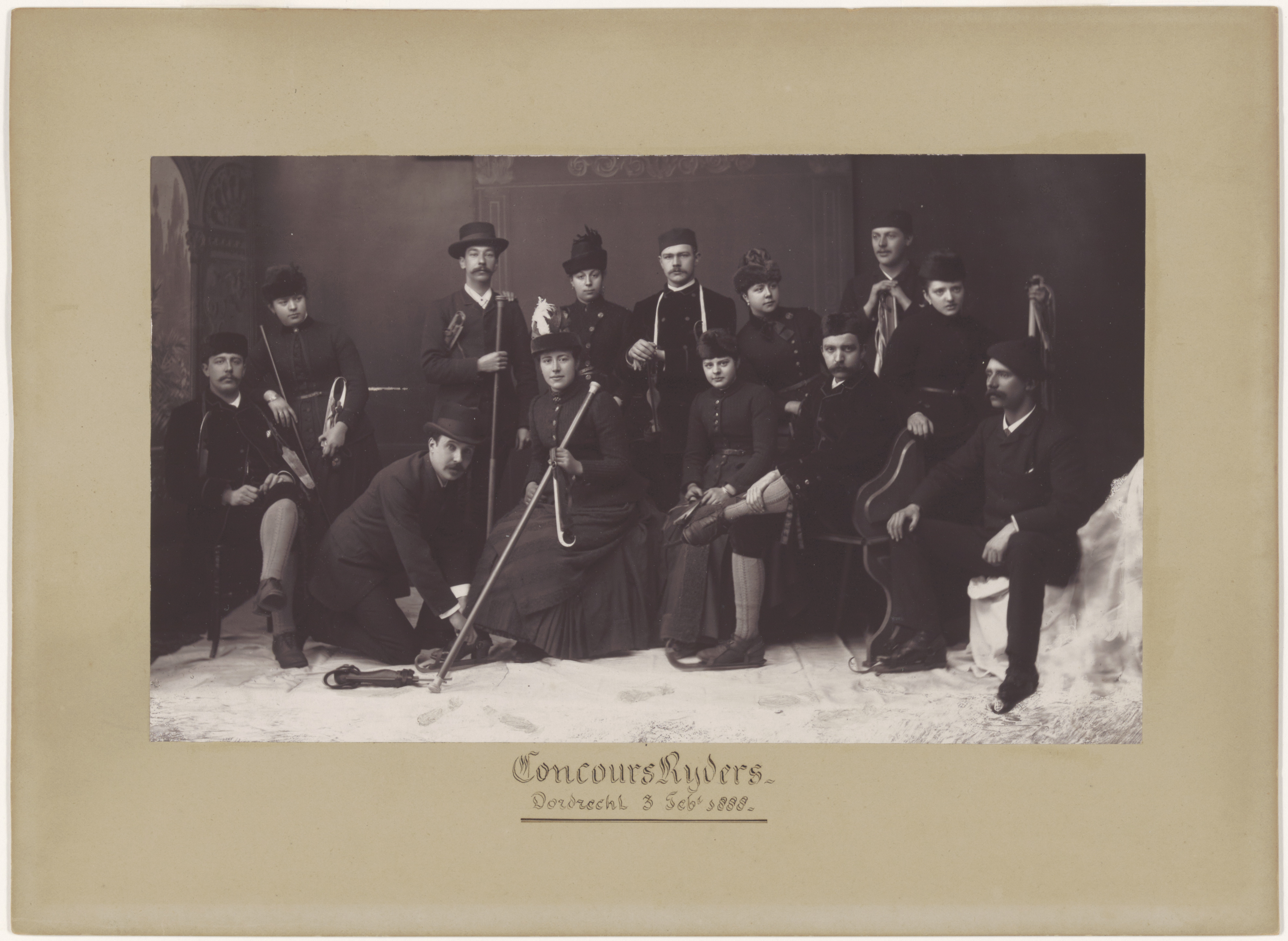 - Groepsportret van leden van de Dordrechtse Sneeuw- en IJsclub naar aanleiding van een schoonrijderij op de schaats voor heren en voor heren- en damesparen in de Windhondpolder op vrijdag 3 februari 1888. Een gezelschap van 13 dames en heren poseert met de schaats in een fotostudio; het zittende meisje rechts in het midden draagt een zilveren armband om de linkerpols, die zij als 1e prijs heeft gewonnen samen met haar broer; haar naam is Betsy van Epenhuijzen (later mevr. E. Maas Geesteranus - Van Epenhuijzen, Velp) uit Zwijndrecht toen 18 jaar oud; zij had een broer B. en C., van wie C. ook een prijs won, en die mogelijk beiden ook op de foto staan; op de vloer lijkt kunstsneeuw te liggen.