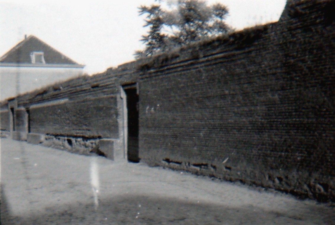 Een gedeelte van de stadsmuur aan de Boogjes, waarachter een open terrein langs het water lag waarop woonwagens werden gestald.