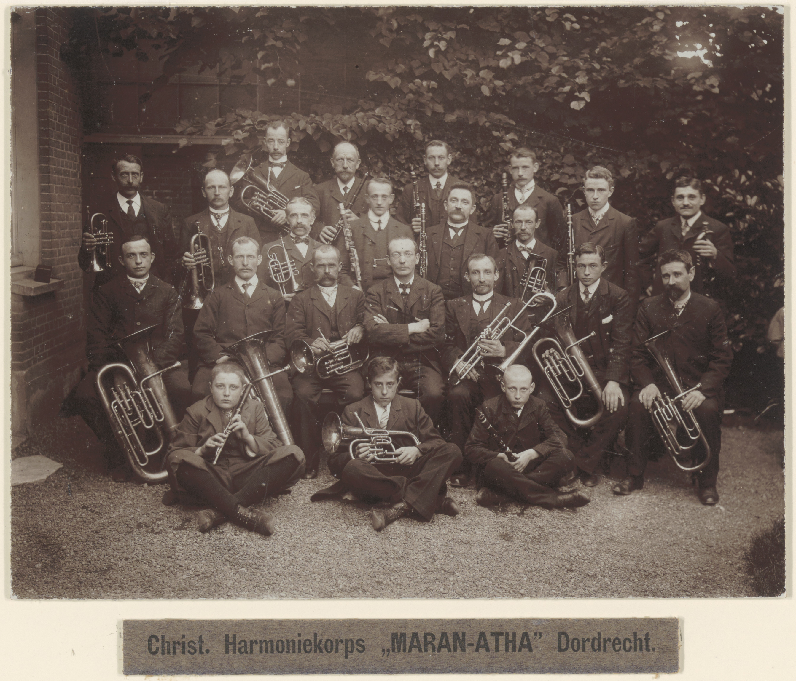 - Groepsportret van het Christelijk Harmonie-korps 'Maran-atha' in een tuin; het korps komt in het adresboek van 1911 voor het eerst voor als Chr. Harmoniegezelschap, 'Maran-atha' in 1916 voor het laatst. Dirigent was de in 1873 geboren tekenonderwijzer Frans Schmidt die dus wel de man met bril en stokje in het midden zal zijn; voorz. was A. Brand Azn, vice-voorzitter A. Frietz, secr. N.J.C. Boeltjes en penningmr. C. van der Ben (adresboek 1911).