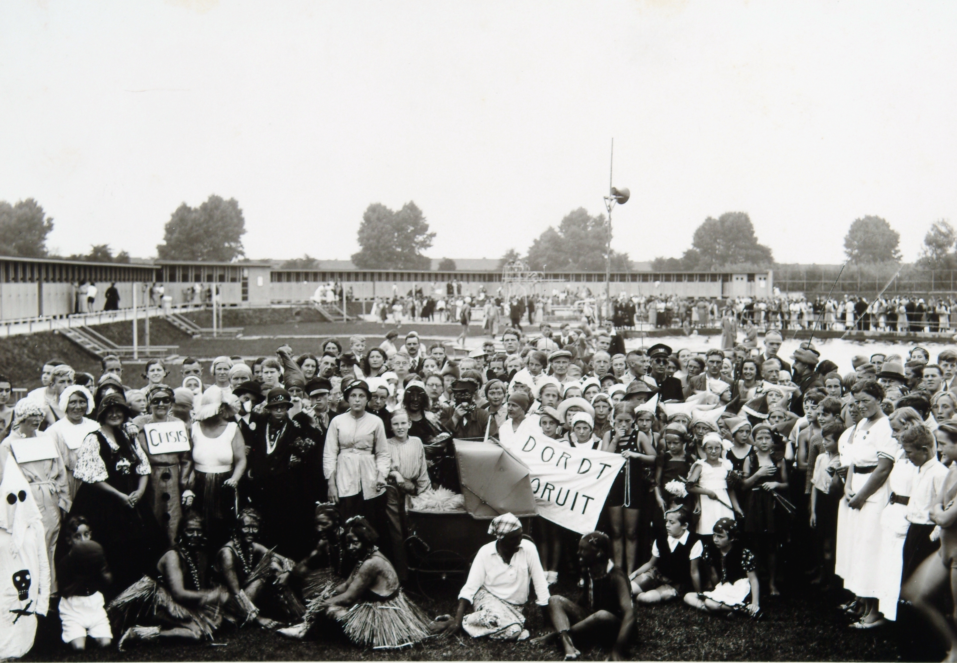 Een zwemfeest in het Wantijbad met klaarblijkelijk de crisisjaren als thema.