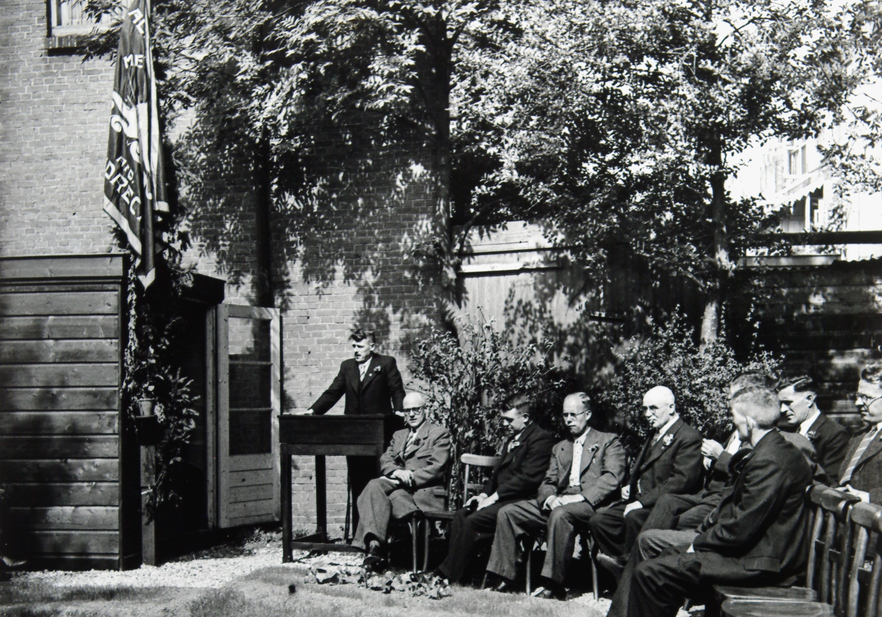Openingsrede in de tuin van het nieuwe gebouw van de Metaalbewerkersbond aan de Singel.