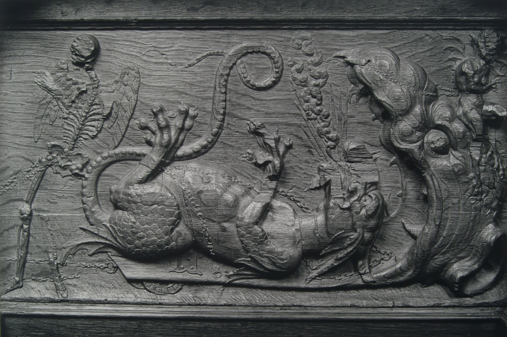 Voorstelling in houtsnijwerk in de panelen van de koorbanken in de Grote Kerk