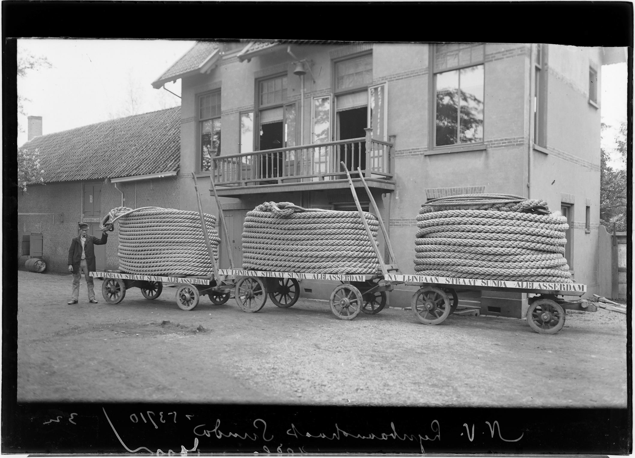 Eigenaar (?) met wagens met touwen van Touwfabriek N.V. Lijnbaan Straat Sunda, …