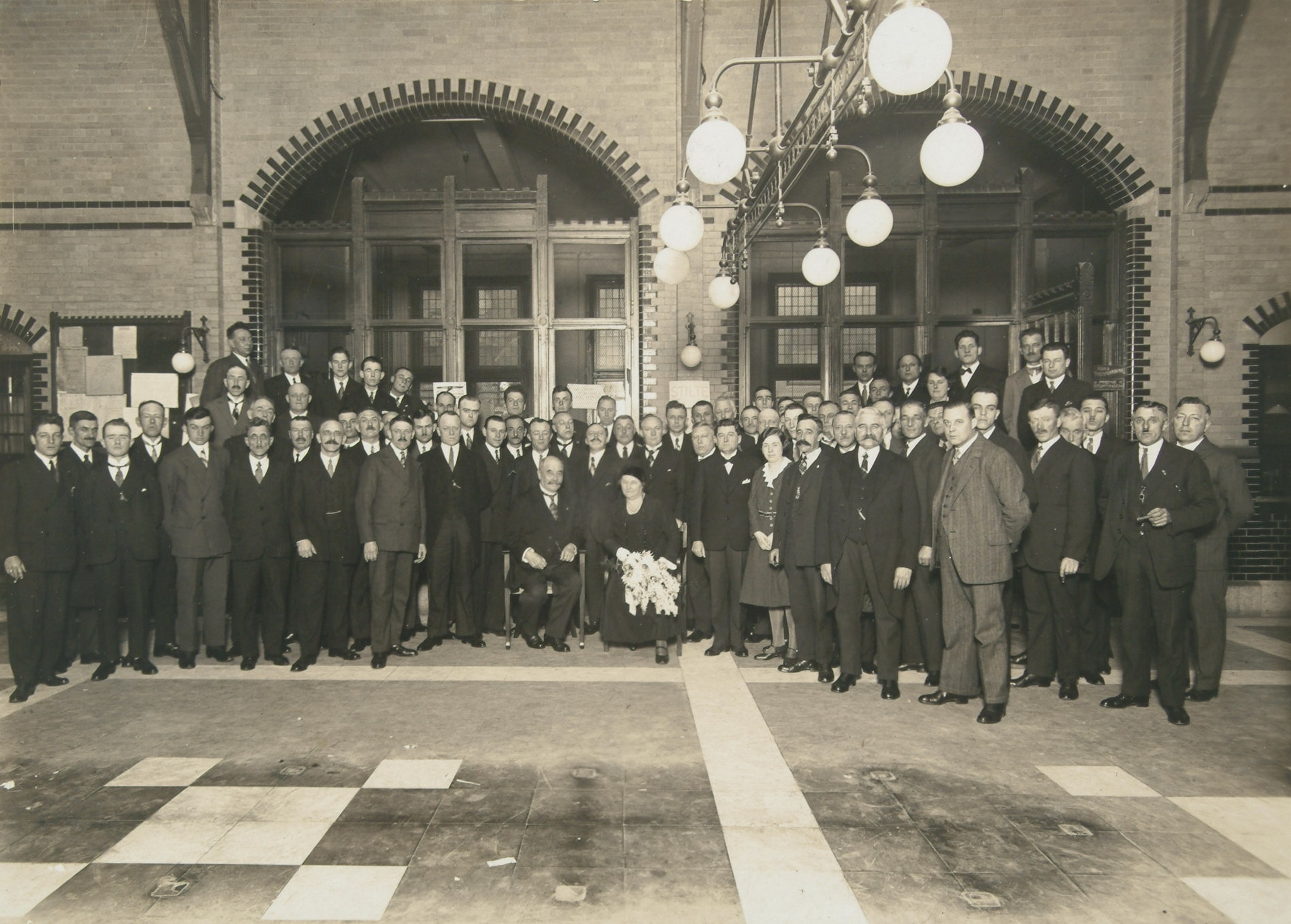 - Personeel en directie in de hal van het postkantoor aan het Bagijnhof