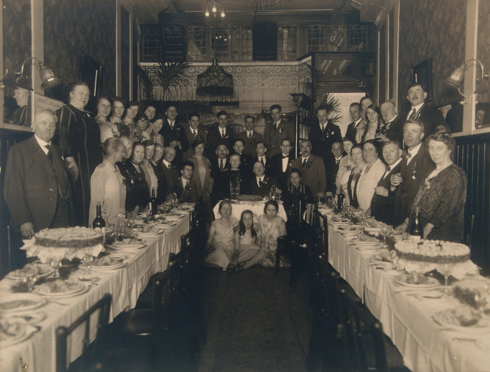 - Links S. Sleeking, J.C. Sleeking-Beglinger, A.W. Sleeking. Kees Hüsen, groep heren en dames uit België, Marie Hüsen, Mw. de Groot, Dhr. de Groot, mw. Van Dijk. Rechts dhr. Stiegelis, dhr. Van Dijk, dhr. Dijkman, onbekend, mej. van ’t Hof, mw. van ’t Hof, mw. C. Candel, dhr. C. Candel, dhr. Hüsen, broer van de bruid, dhr. Raaimakers, mw. Raaimakers, broer en zwager van de bruidegom