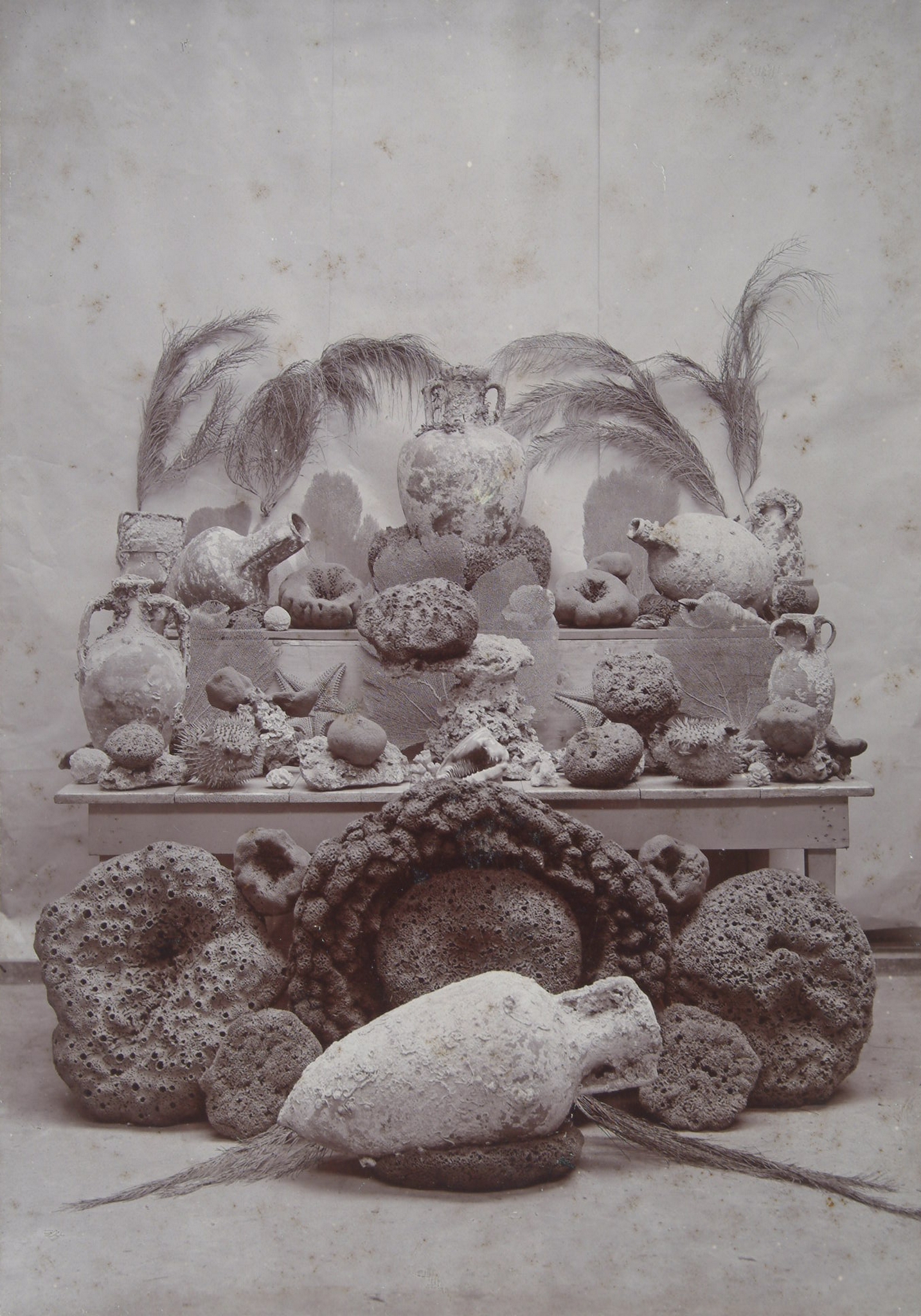 Stilleven met sponsen, kruiken en andere opgedoken zeecuriosa