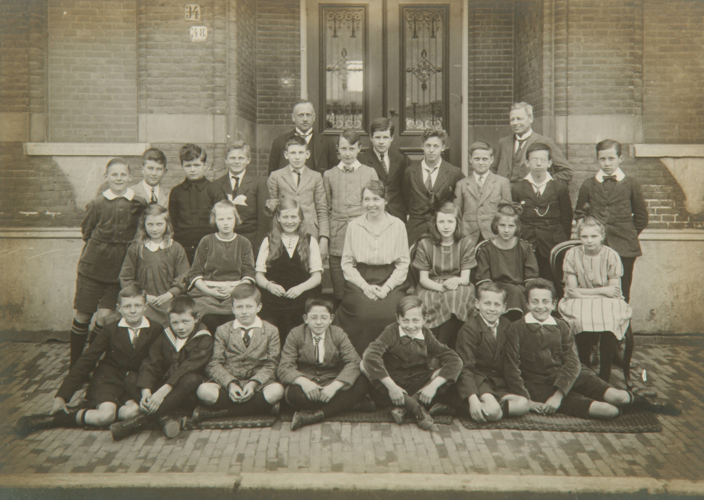 Groepsportret van een klas van het gymnasium voor de ingang van het gebouw aan de Cornelis de Wittstraat.