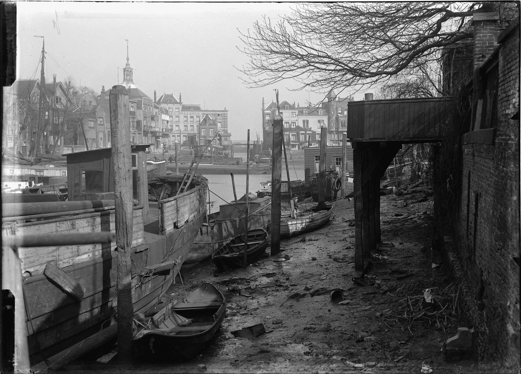 - Laag water in de Wijnhaven, ongeveer vanaf de Turfsteiger in noordelijke richting van Groothoofdspoort, hotel Bellevue en Boombrug gezien. Op de achtergrond rechts van het midden panden aan de Taankade.