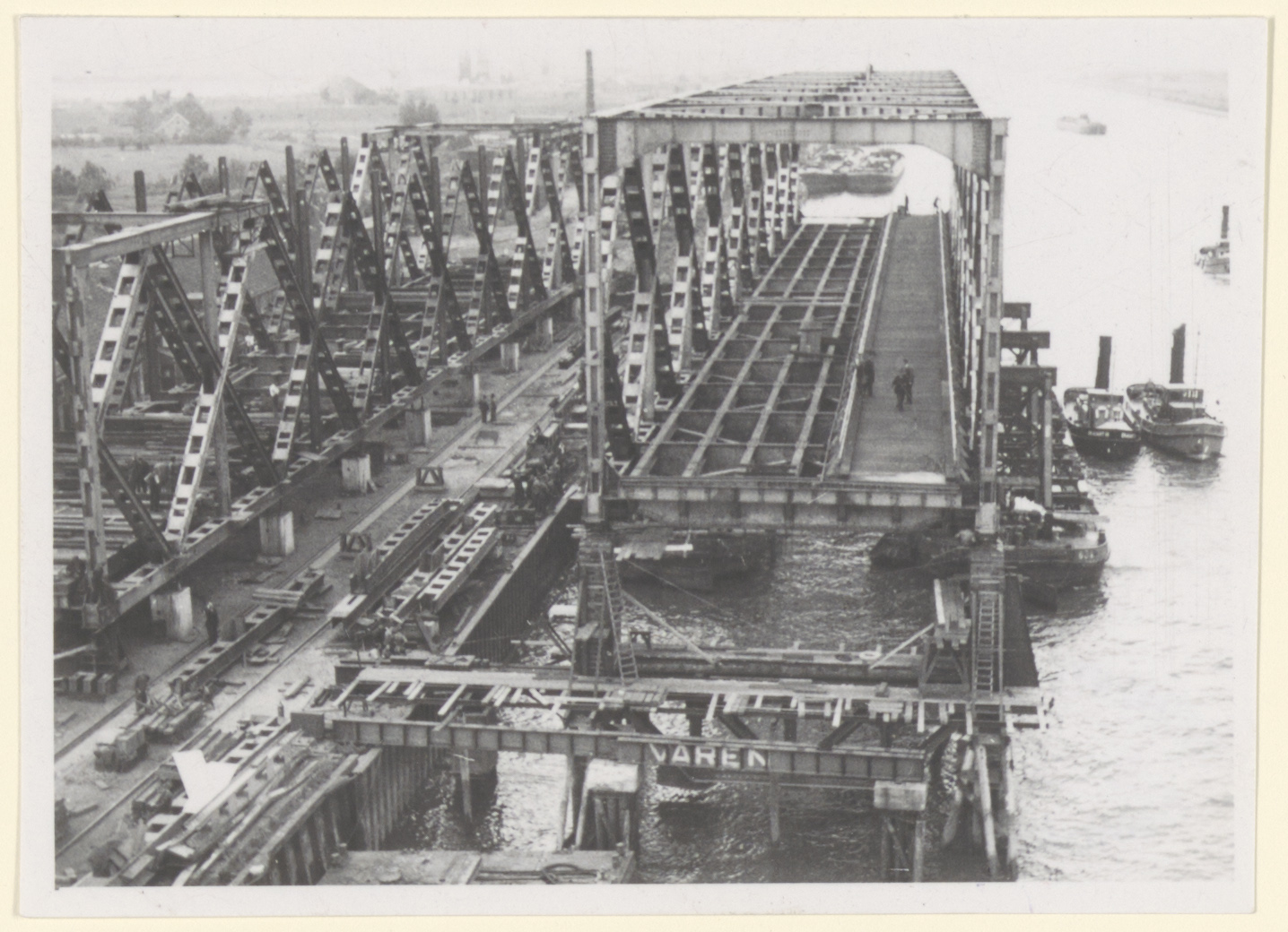 Datering kan wat strakker. Het rechter brugdeel wordt hier op de draagconstructie gelegd. De eerste overspanning is op 28 maart 1935 op de draagconstructie gelegd. De negende overspanning is opgelegd en vertrokken bij de werf op 19 mei 1936 (er liggen hier nog twee spanningen dus ten laatste de 9e en de 10e). Datering derhalve 28 maart 1935 - 19 mei 1936.