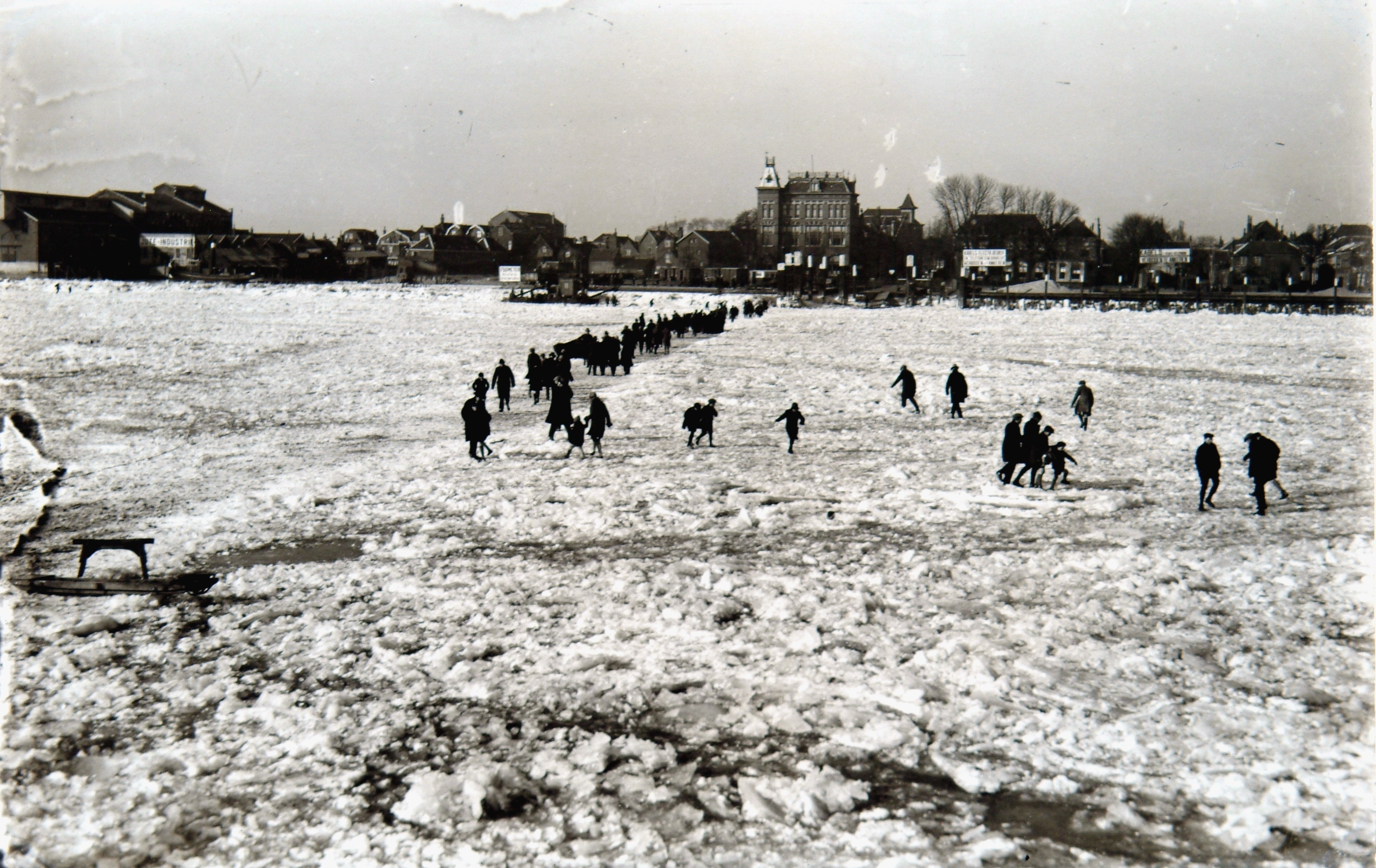 De dichtgevroren Oude Maas bij het Zwijndrechts veer. Voetgangers konden van de ene naar de andere kant van de rivier lopen. Op de achtergrond ligt Zwijndrecht.