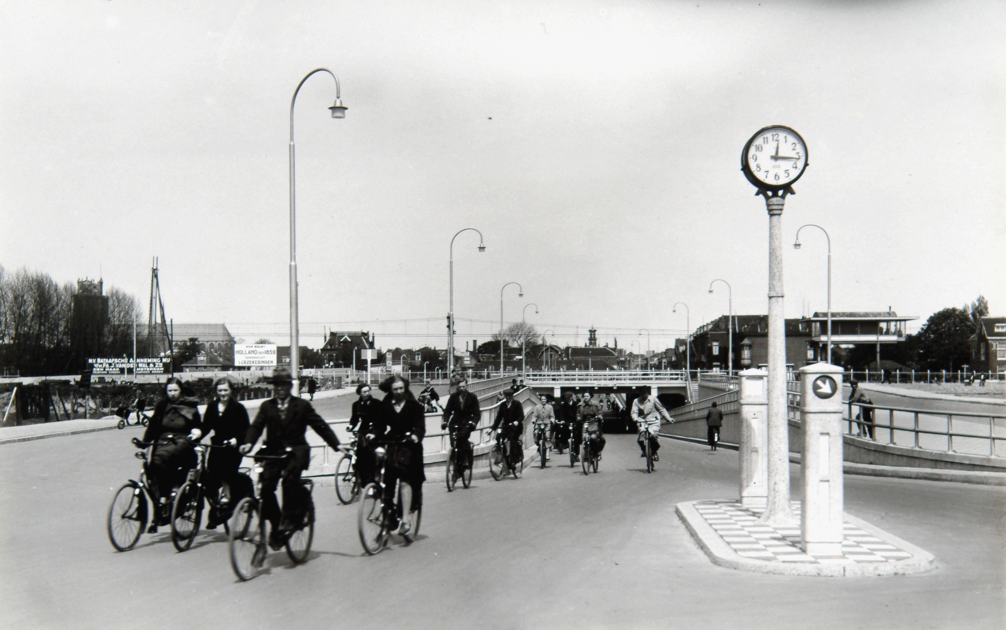 Fietsers komen uit de Krispijntunnel aan de Krispijnse kant. Links staat de heistelling gereed voor de bouw van De Holland, rechts is het seinhuis nog te zien.