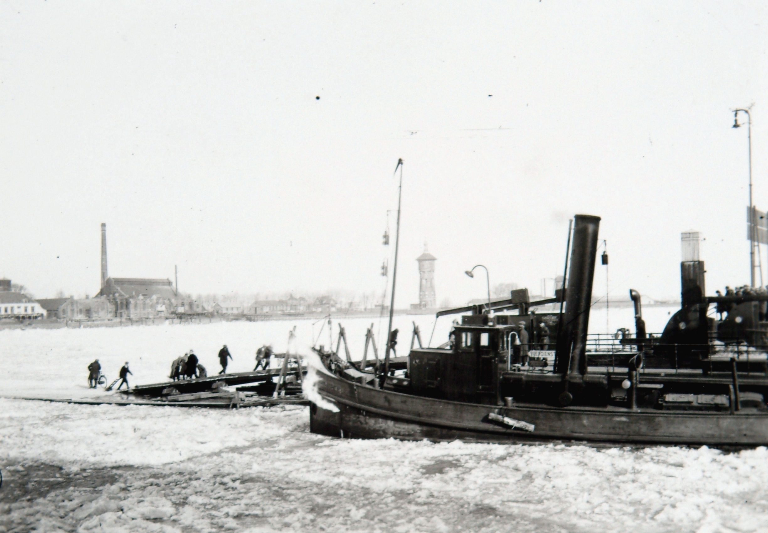 - De bevroren Oude Maas vanaf het Zwijndrechts veer in Dordrecht. De mensen geheel rechts kijken toe hoe anderen gebruik maken van het plankier om over het ijs van en naar Zwijndrecht te kunnen gaan.
