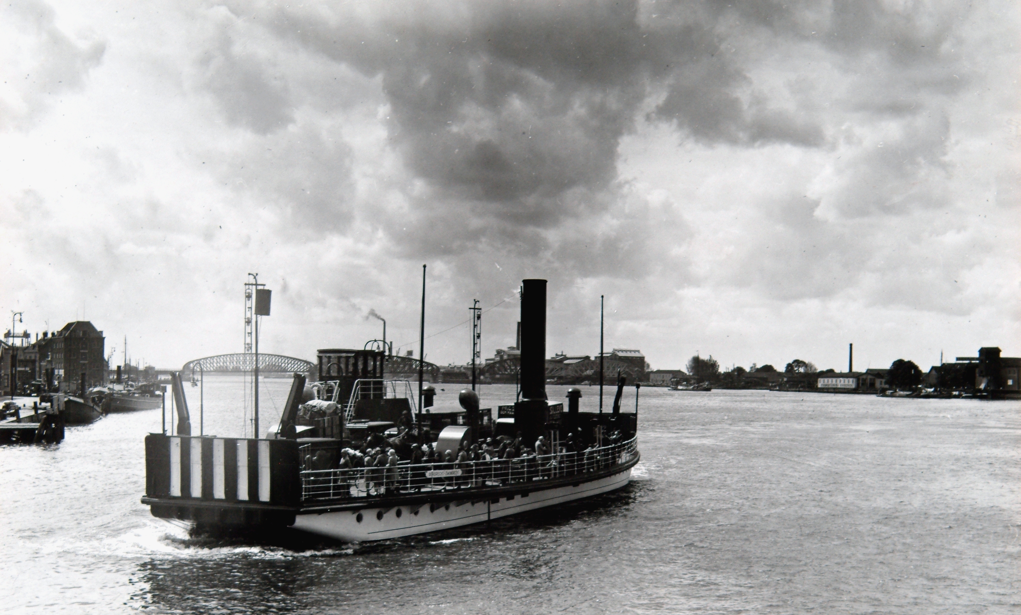 - "Veerdienst VIII" midden op de Oude maas tussen Dordrecht (links) en Zwijndrecht. Middenachter is de spoorbrug zichtbaar.