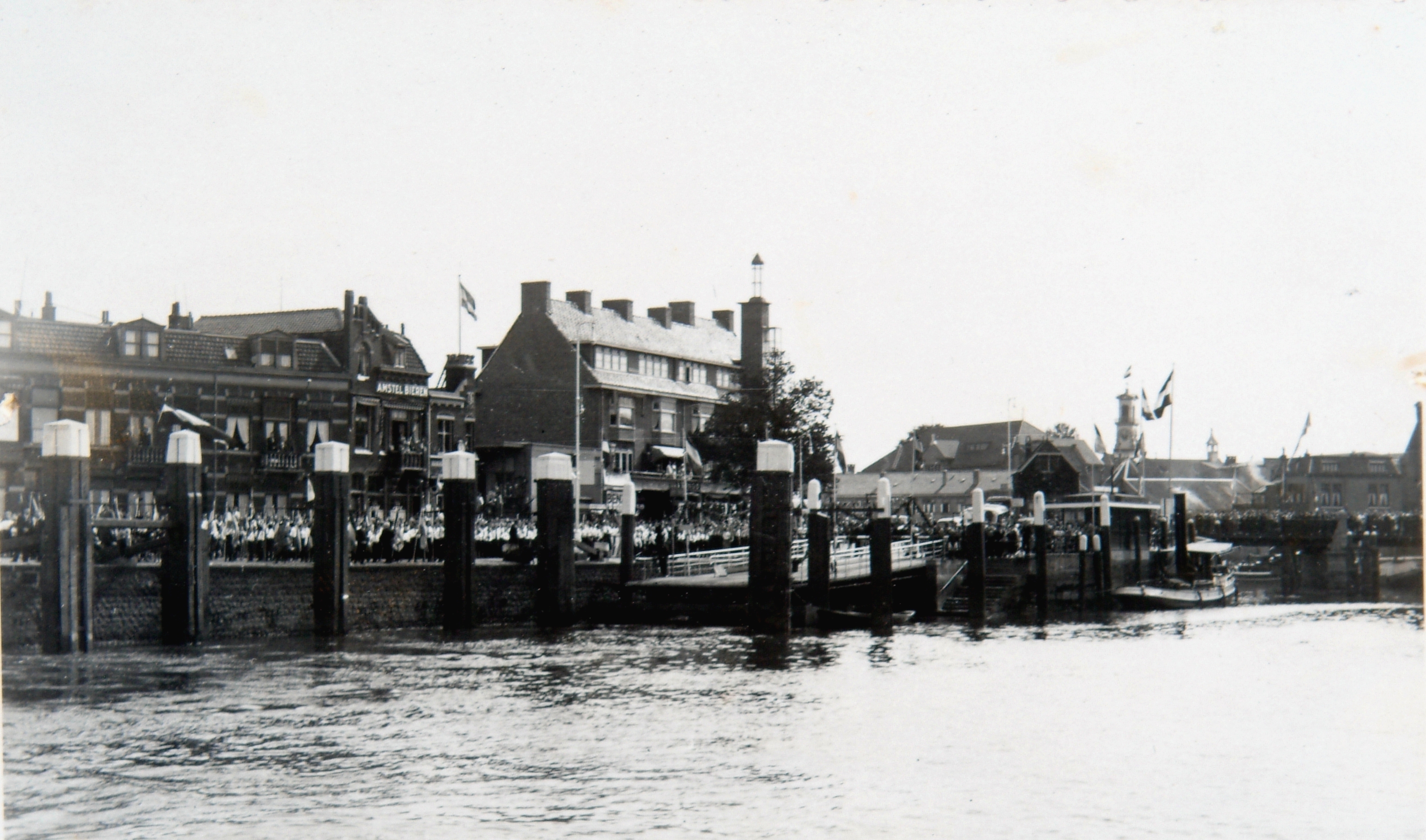- Drukte op het Blauwpoortsplein bij het Zwijndrechts veer. T.g.v. het regeringsjubileum wordt de Dordtse vlag naar het defilé in Amsterdam gebracht.