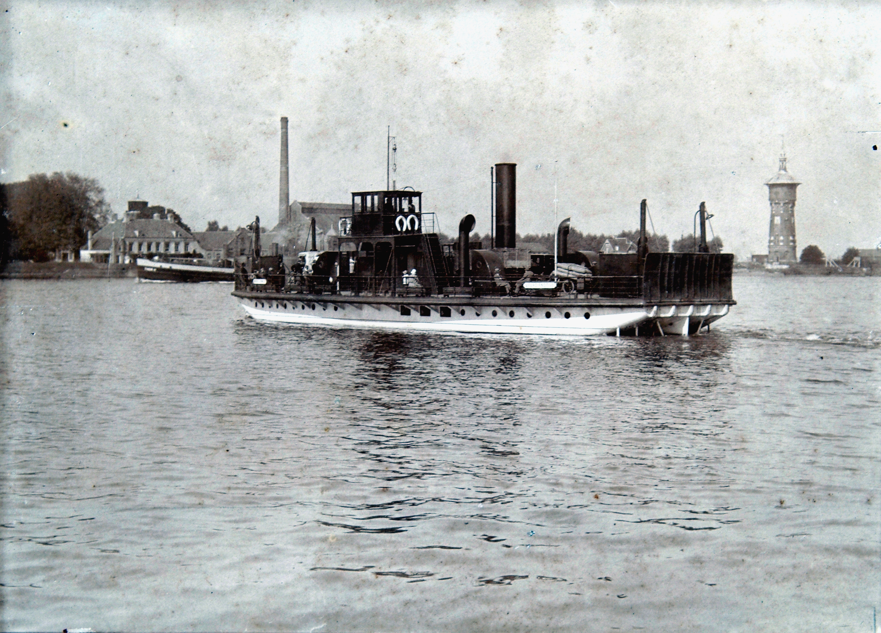 - Een veerpont op de Oude maas tussen Zwijndrecht (achtergrond) en Dordrecht.