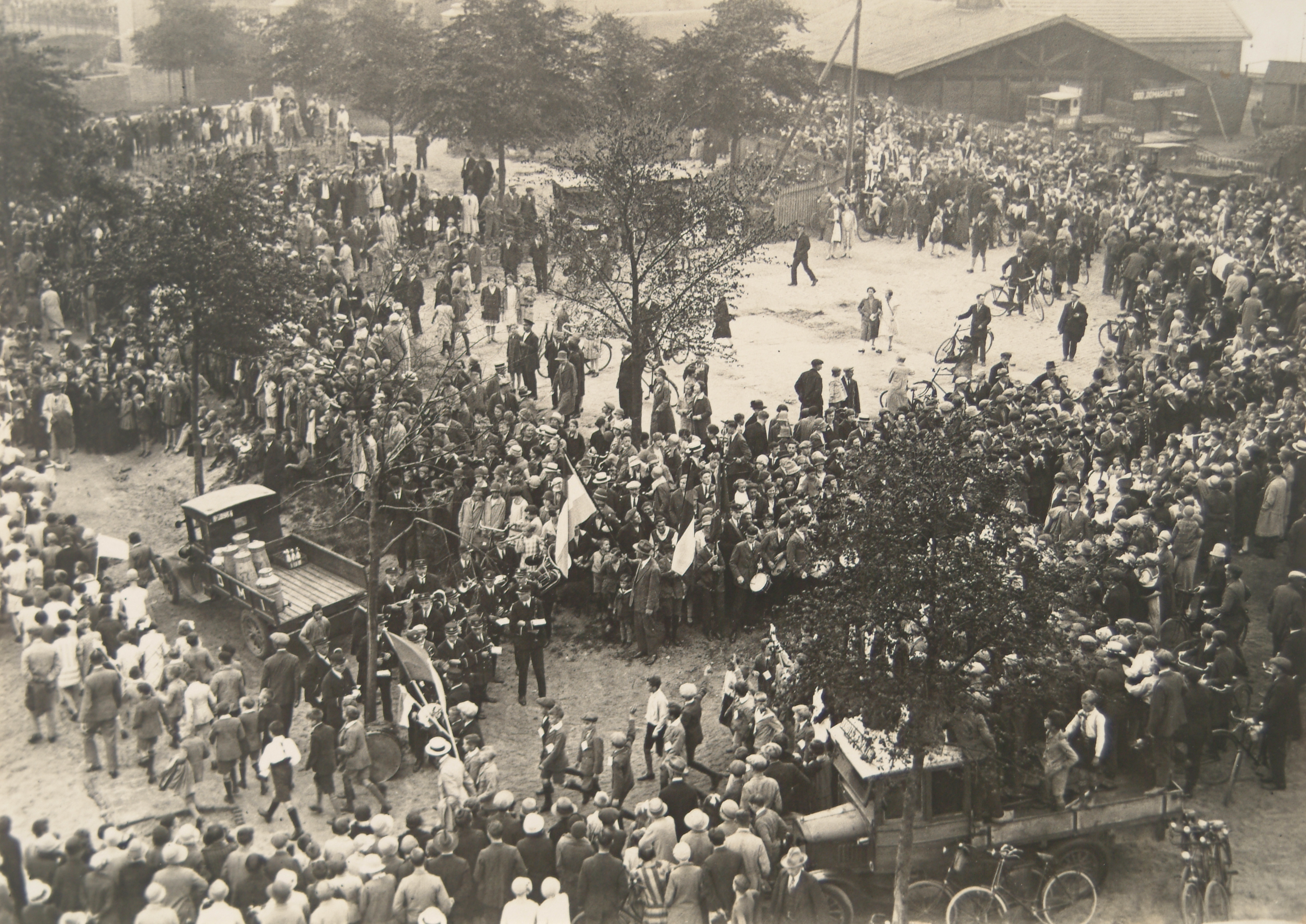 fanfarekorpsen melkboeren melkbussen optochten publiek / toeschouwers vlaggen(stokken) vrachtwagens