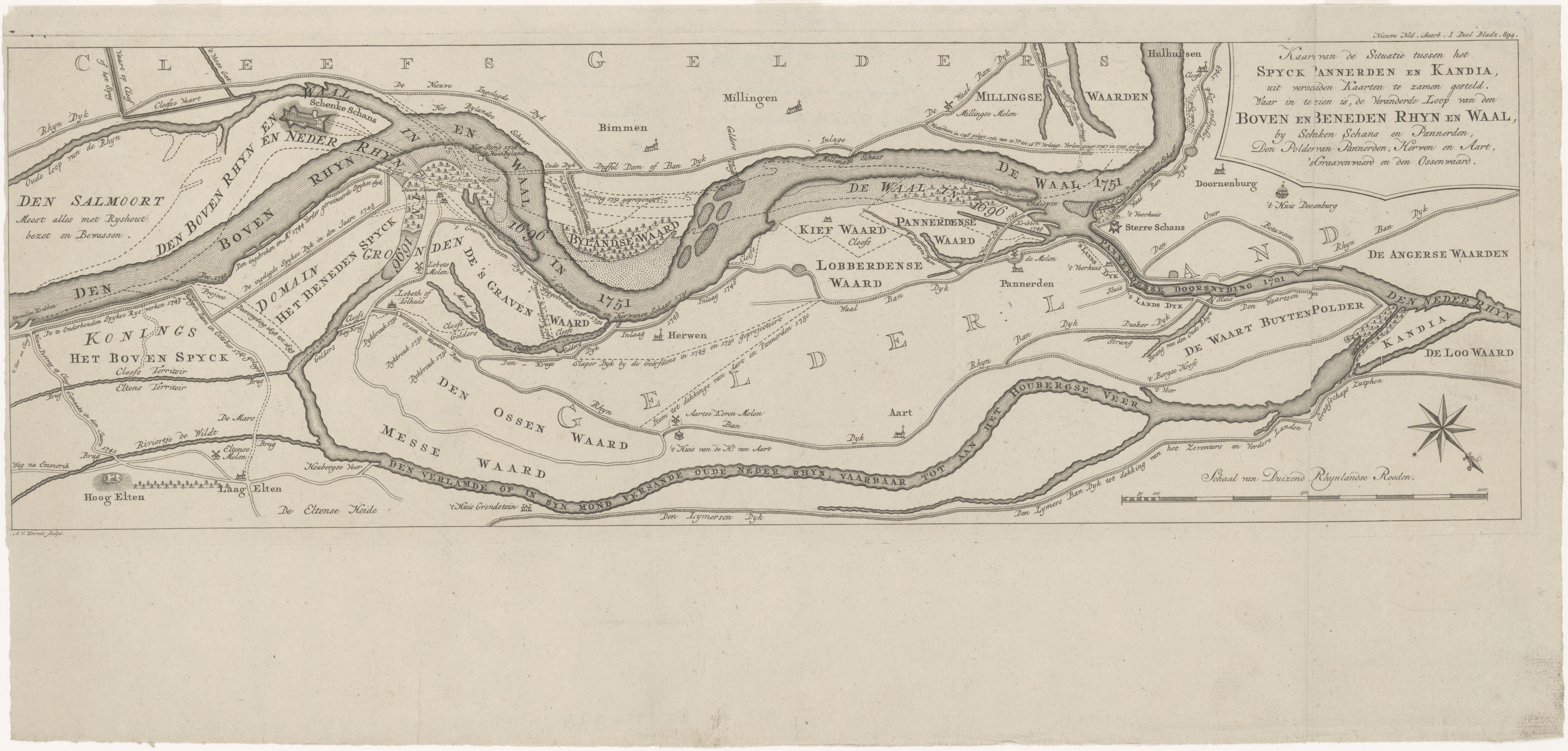 Kaart van de loop van de Rijn en de Waal tussen het Spijck en de Pannerdense Doorsnijding van 1707. Verschillende oude en nieuwe dijken, alsmede oude rivierbeddingen zijn ingetekend. De loop van de Bovenrijn en Waal in 1751 en een "geproponeerde" doorsnijding uit dat jaar.