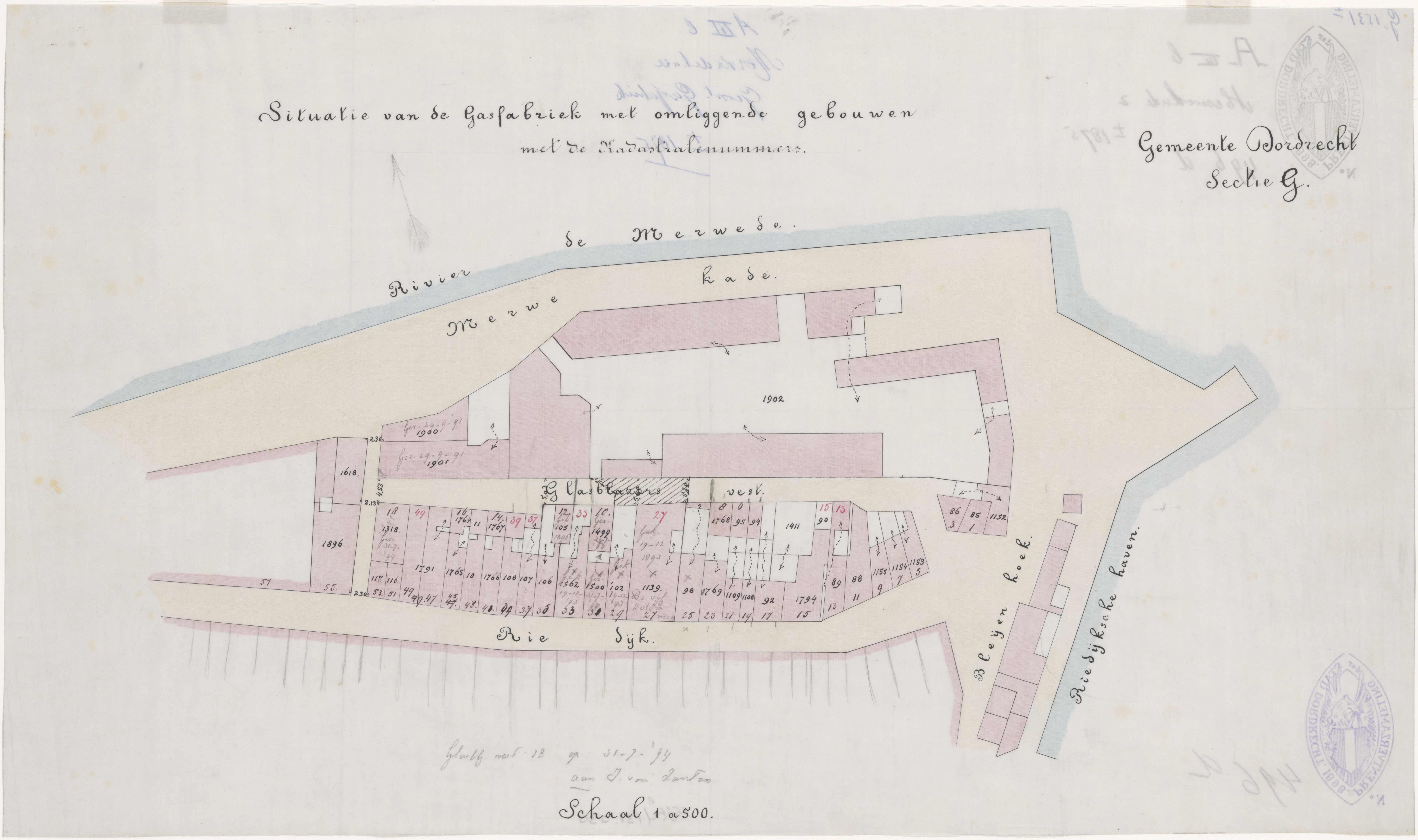 - Kadastrale plattegrond van het terrein van de gasfabriek e.o. (tussen Merwekade, Bleijenhoek en Riedijk).