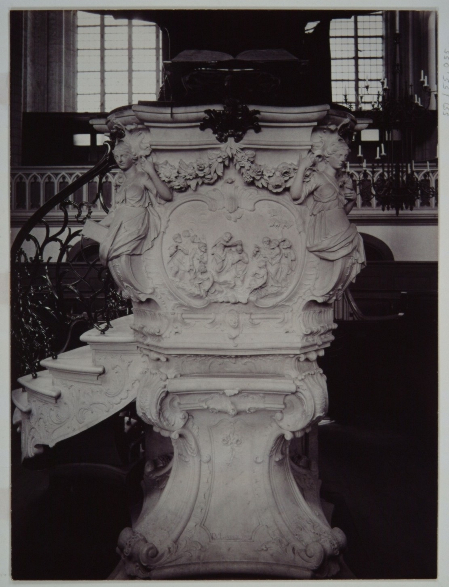 Preekstoel Grote Kerk, zuidkant: bas-reliëf: de doop van Christus door Johannes; hoekbeelden: Geloof en Liefde