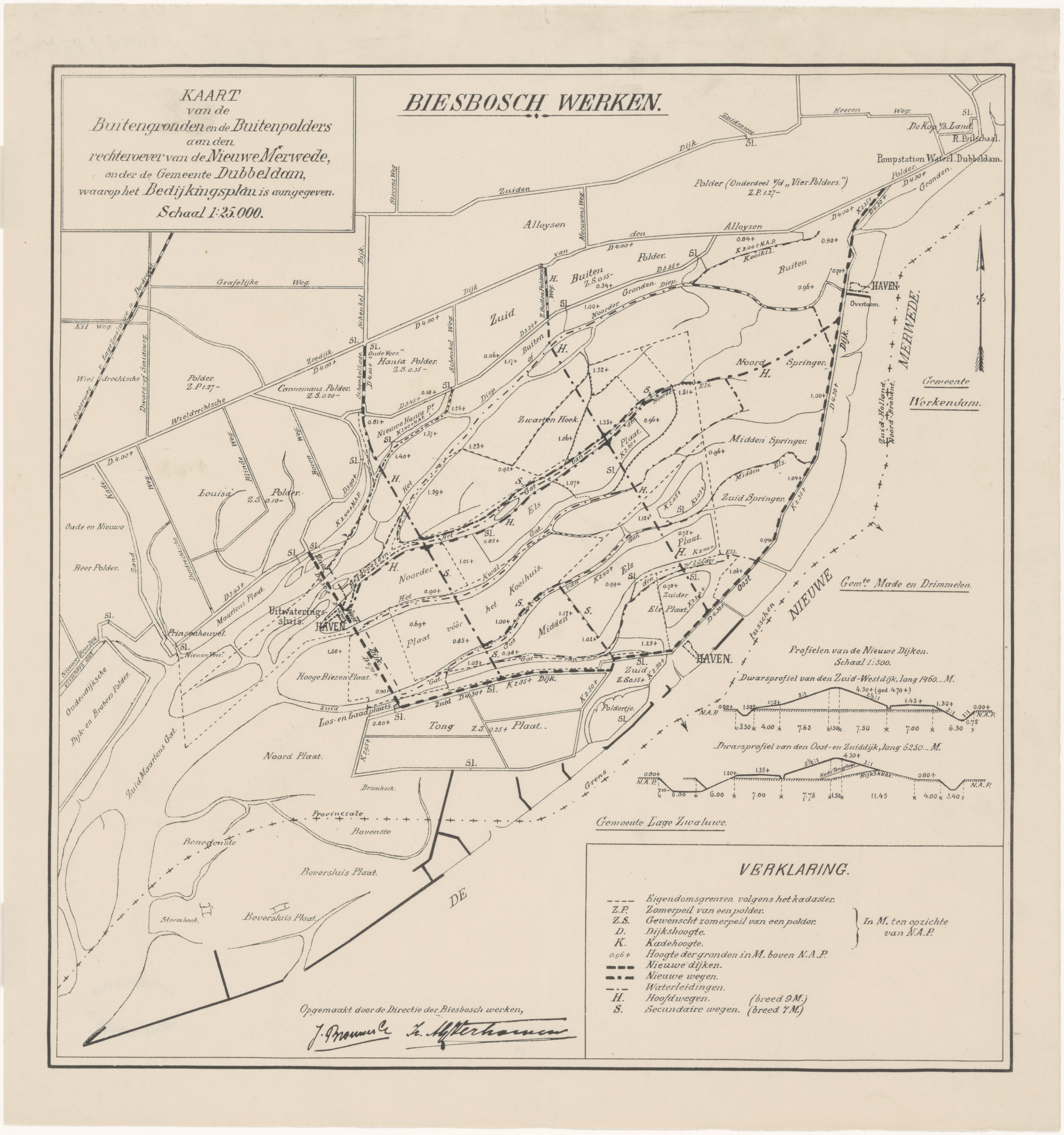 - Kaart van het deel van het eiland van Dordrecht tussen de Nieuwe Merwede en de Wieldrechtse Zeedijk: de Hollandse Biesbosch. Tevens ook met aanduiding van o.a. nieuwe dijken en wegen n.a.v. inpolderingen.