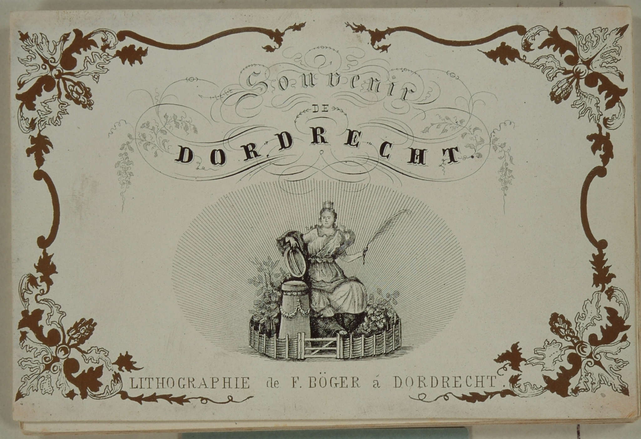 - De Dordtse stedemaagd op het titelblad van een Souvenir de Dordrecht, samen met een plattegrond en 16 stadsgezichten naar tekeningen van J.H. v.d. Heyden in een kartonnen kokertje