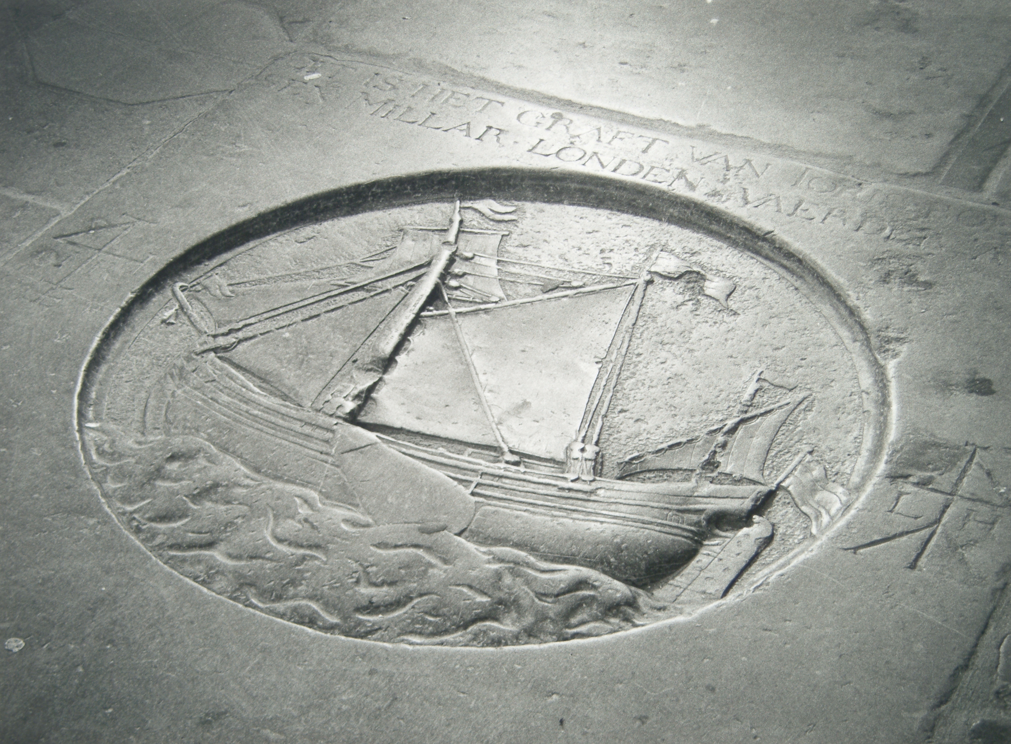 Grafsteen met afbeelding van een schip in Nieuwkerk