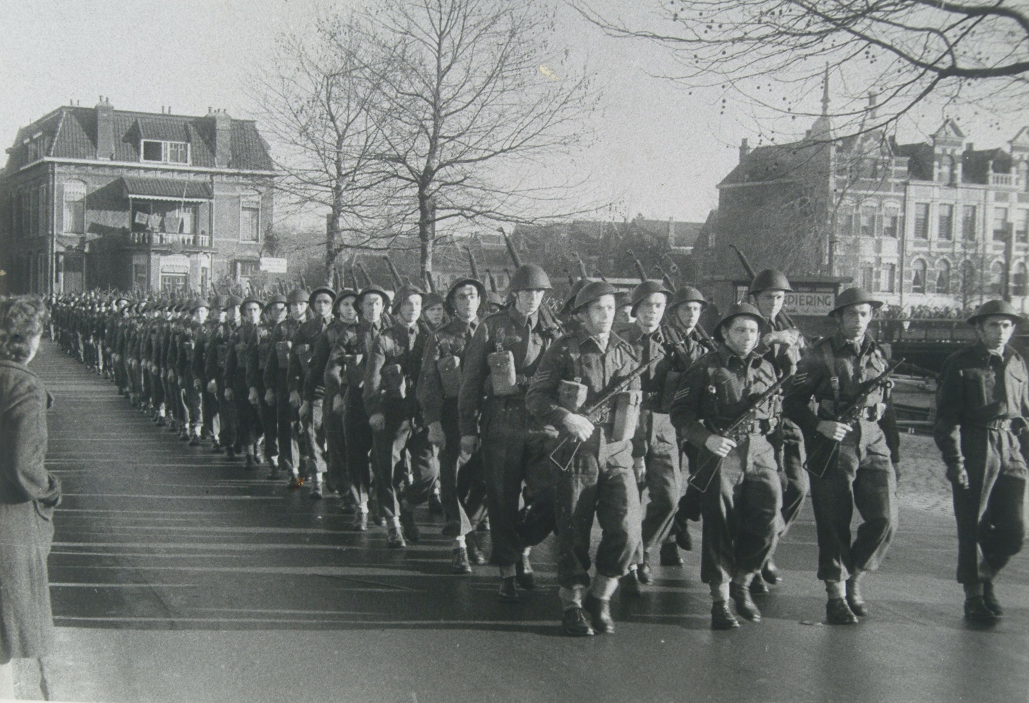 Colonne pontonniers op mars over de Vest ter hoogte van de Vriesebrug