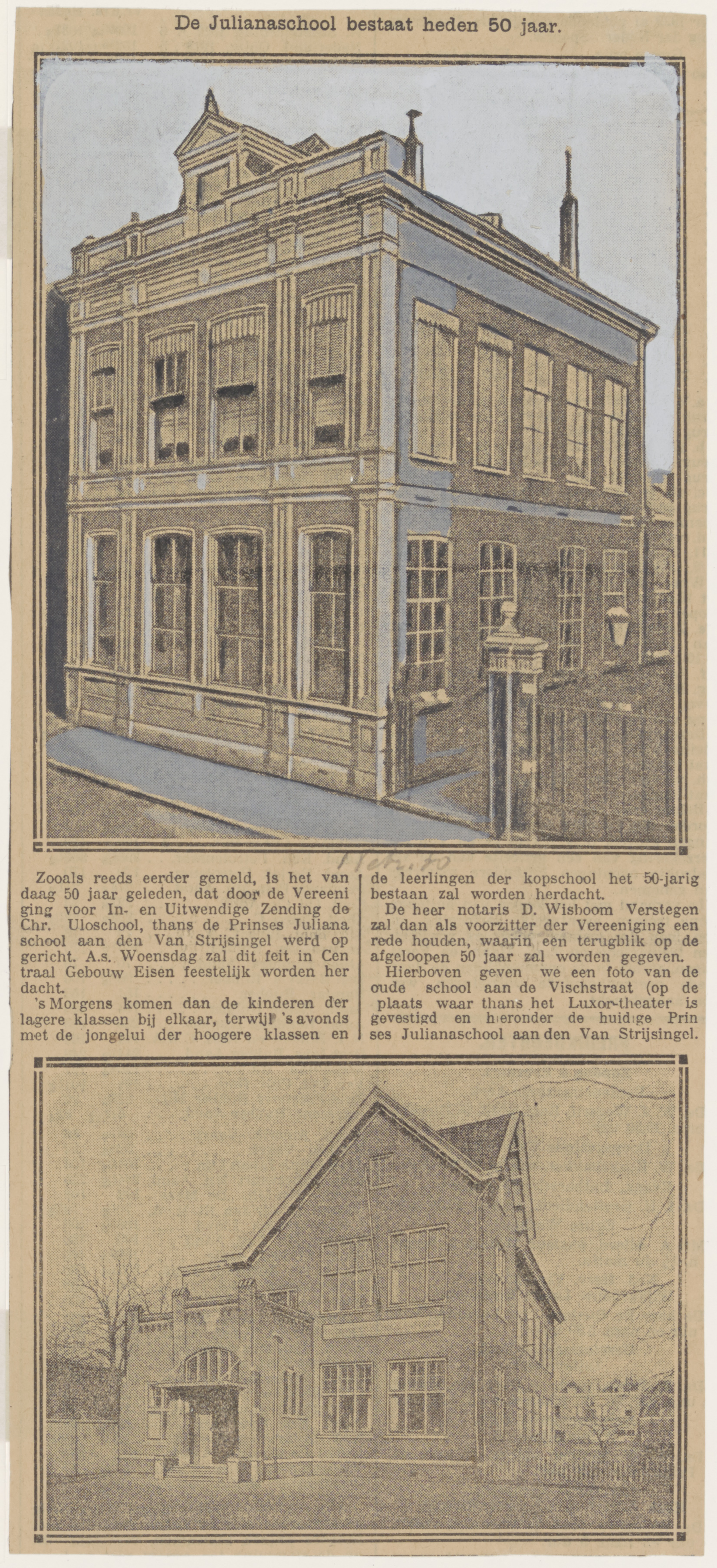De Julianaschool aan de van Strijsingel is in sept. 1909 geopend, dus als het krantenbericht is geschreven ter ere van het 50-jarig bestaan van dit pand, komt het bericht uit 1959.