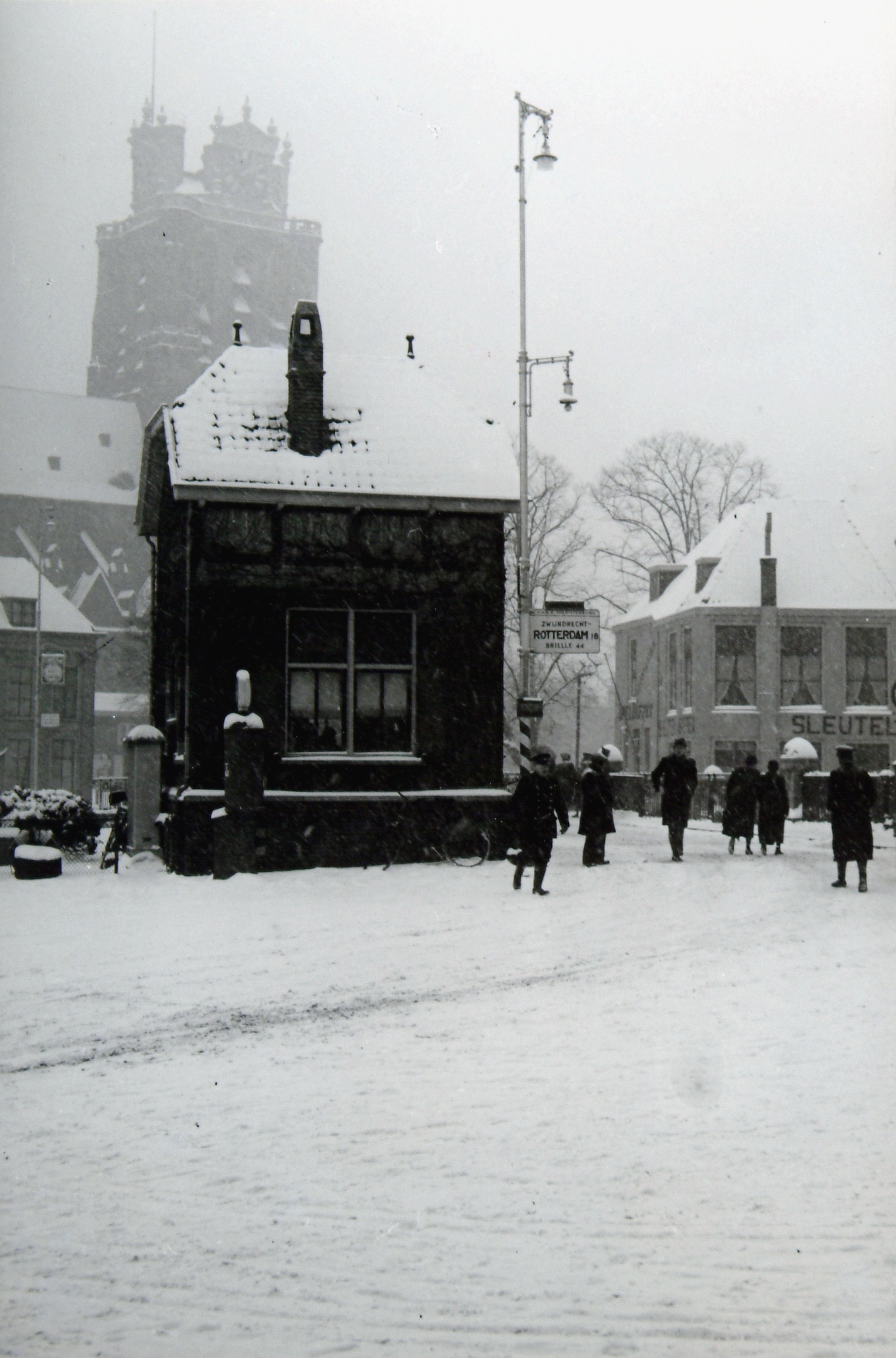 De Engelenburgerbrug met het brugwachtershuis in de sneeuw.